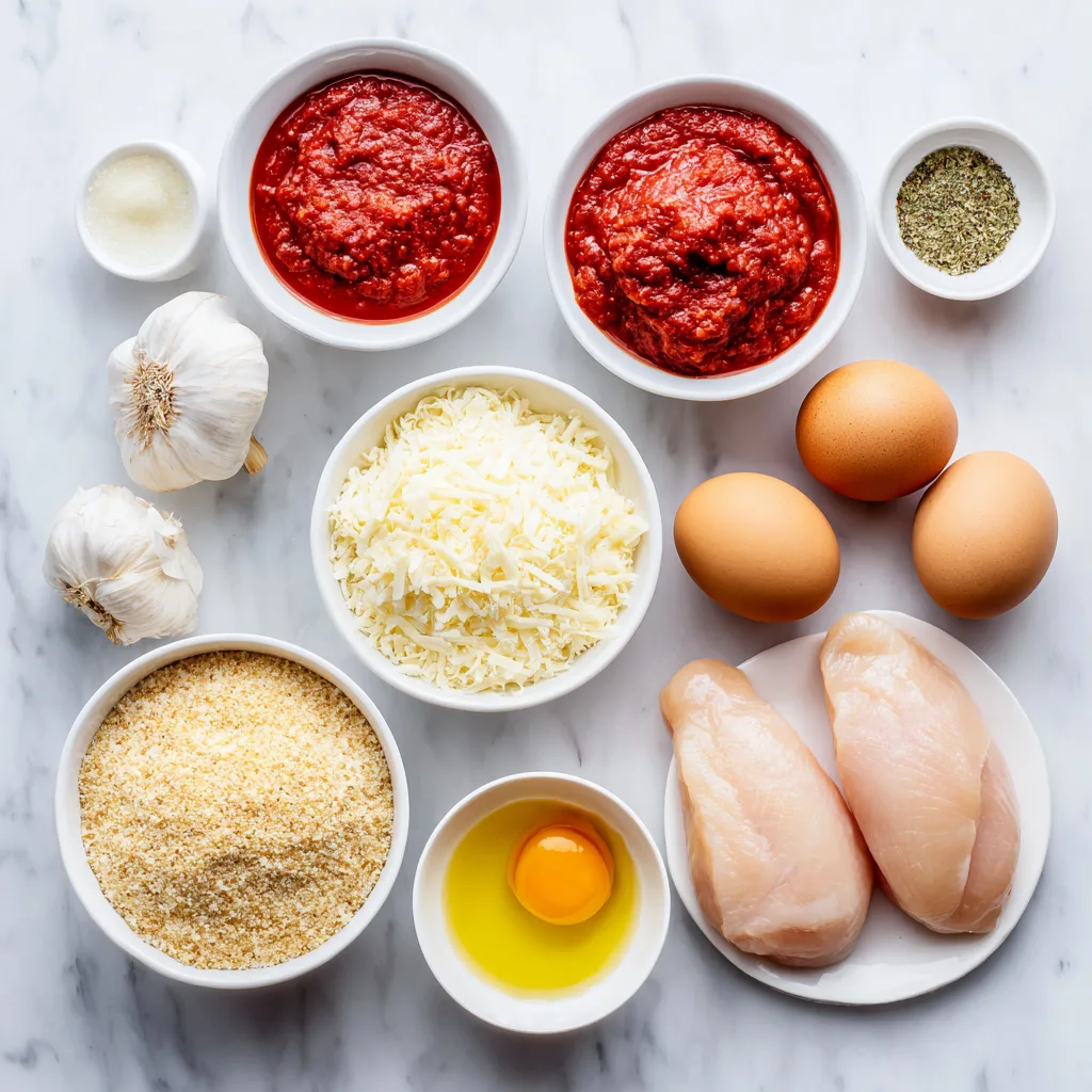 Dip each chicken breast in the beaten egg, then coat with breadcrumbs, pressing lightly to adhere. - Layer the Sauce and Chicken: