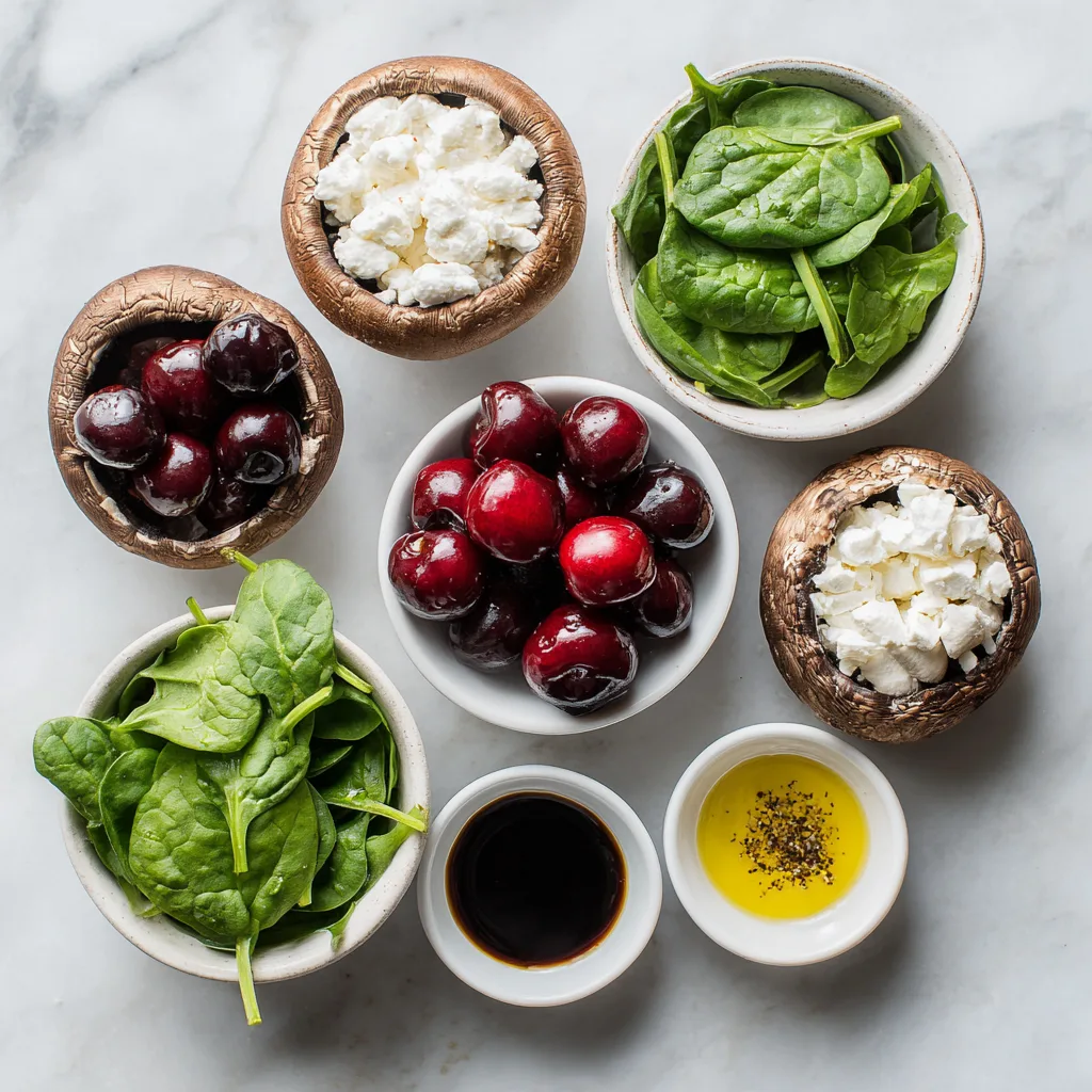 Savory portobello mushrooms stuffed with a tangy-sweet blend of cherries, goat cheese, and sautΓ©ed spinach for a gourmet vegetarian meal.
