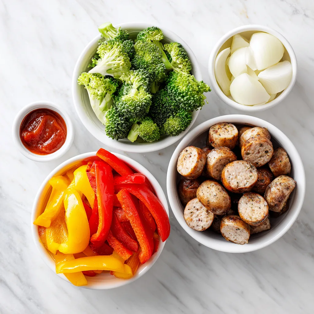 - Prepare the ingredients: Slice chicken sausages into bite-sized pieces. Cut bell peppers, zucchini, and broccoli into similar-sized pieces for uniform cooking.