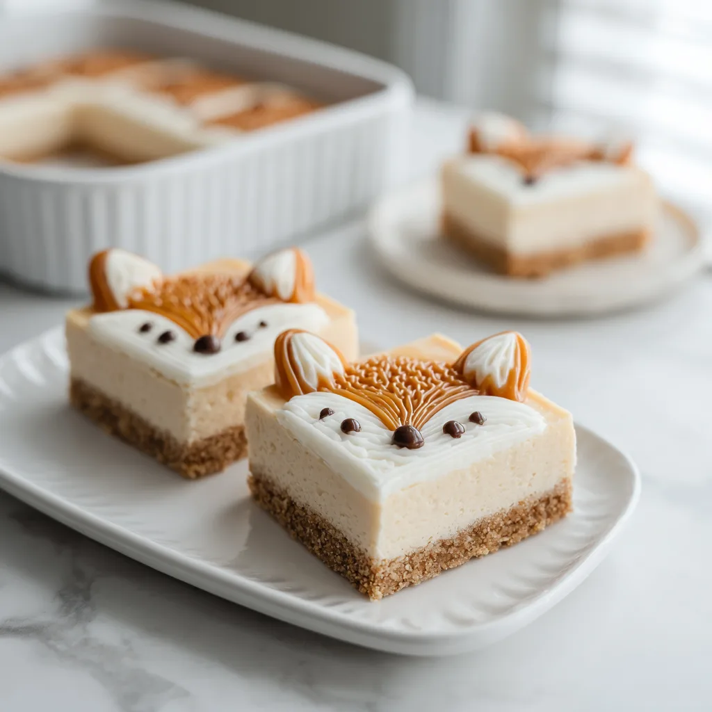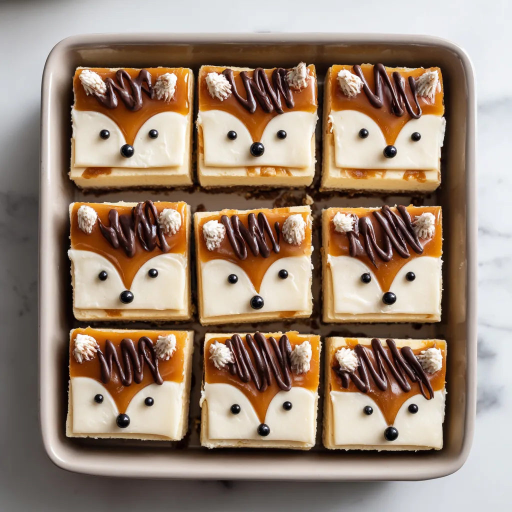 Creamy caramel cheesecake bars decorated as adorable fox faces, perfect for fun desserts and special occasions.