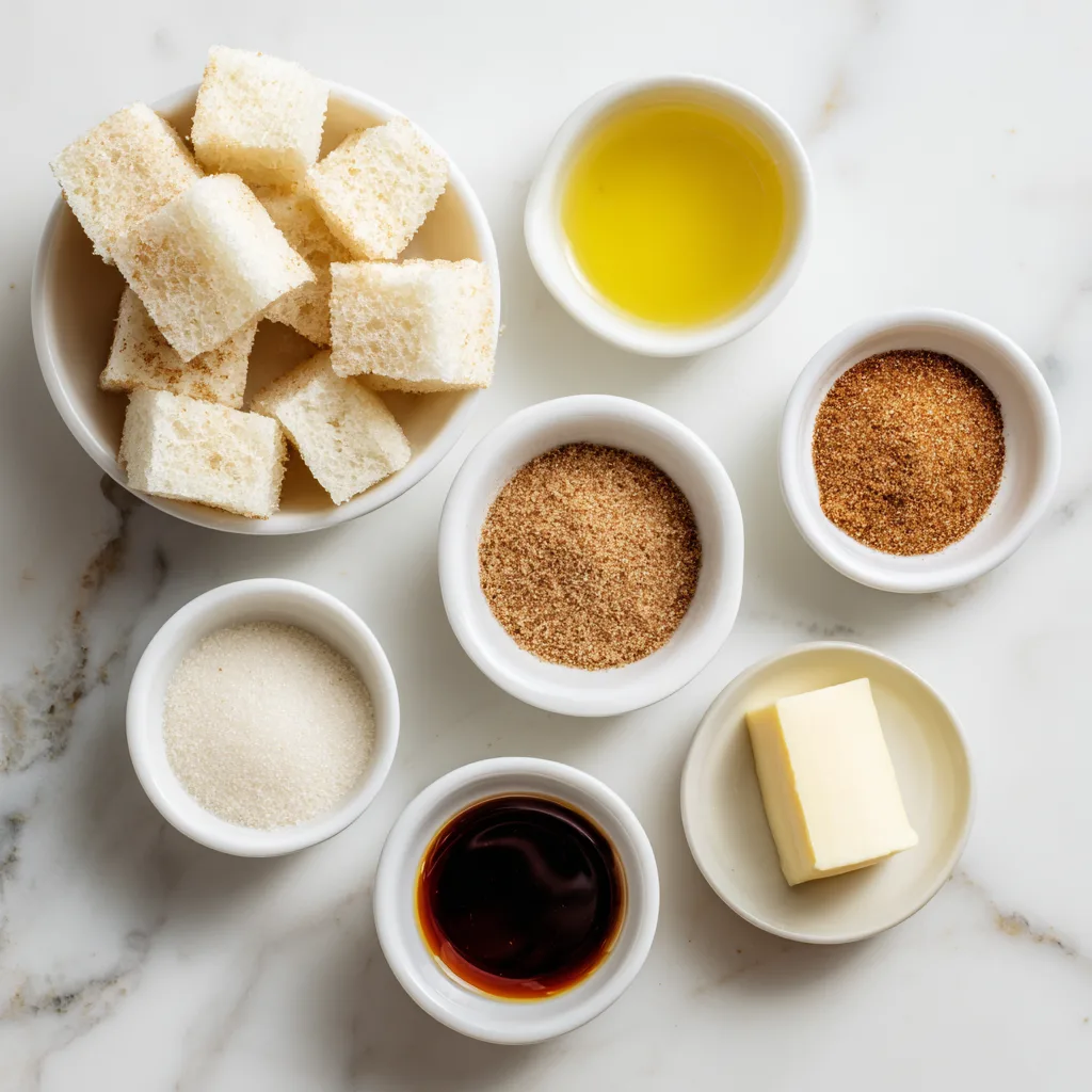 Cut the angel food cake into bite-sized cubes, about 1 to 1½ inches each. Try to keep the pieces uniform so they cook evenly. - Make Cinnamon Sugar Coating