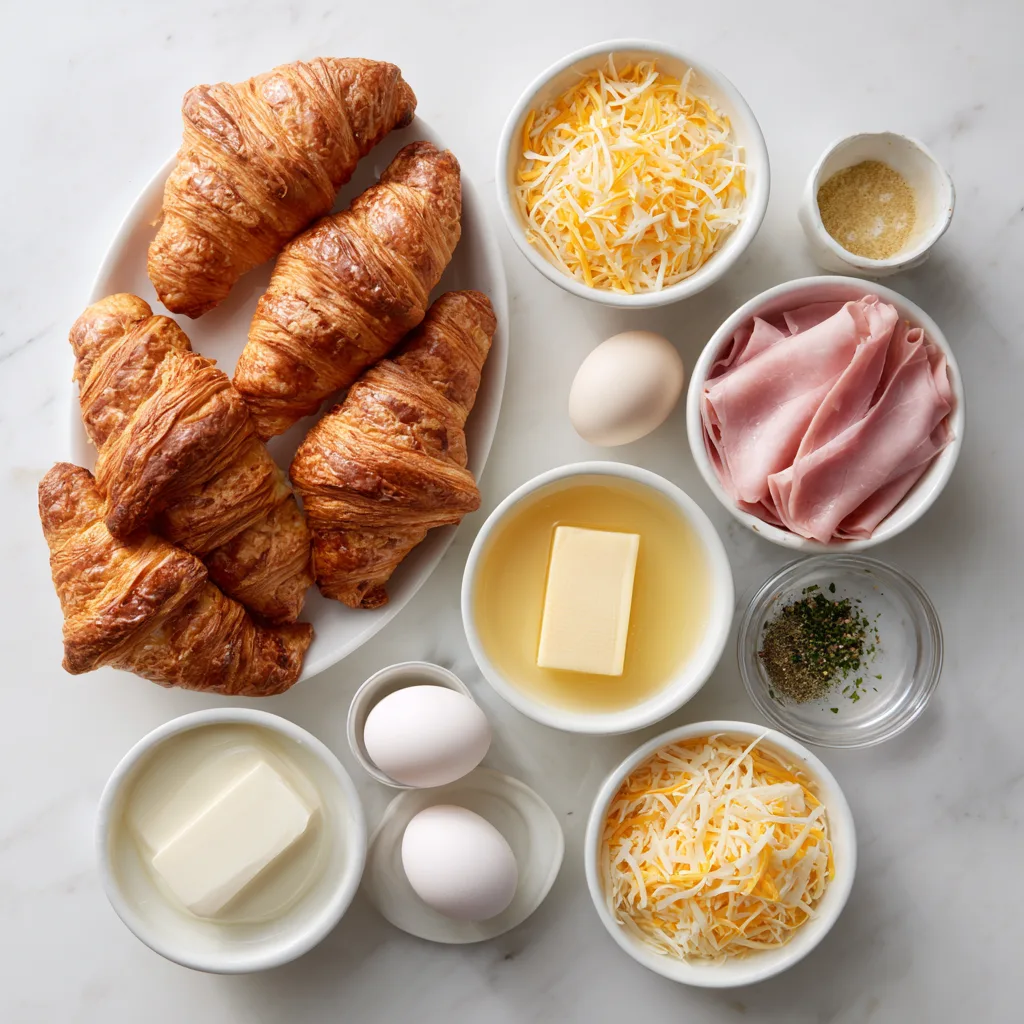 A rich and savory baked dish made with flaky croissants, ham, melted cheese, and a buttery custard, perfect for brunch or an easy comfort meal.