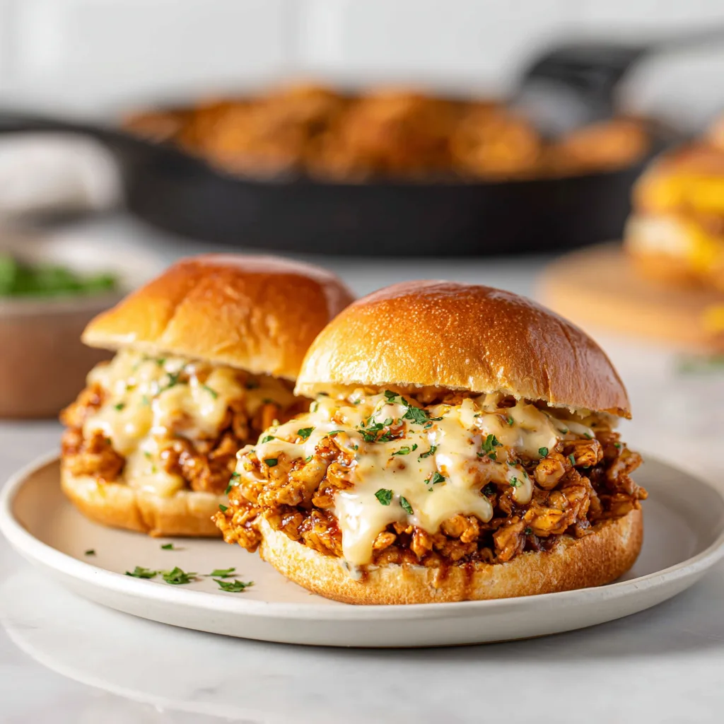 Bold Cajun-spiced chicken sloppy joes topped with a rich, creamy cheese sauce on soft brioche buns.