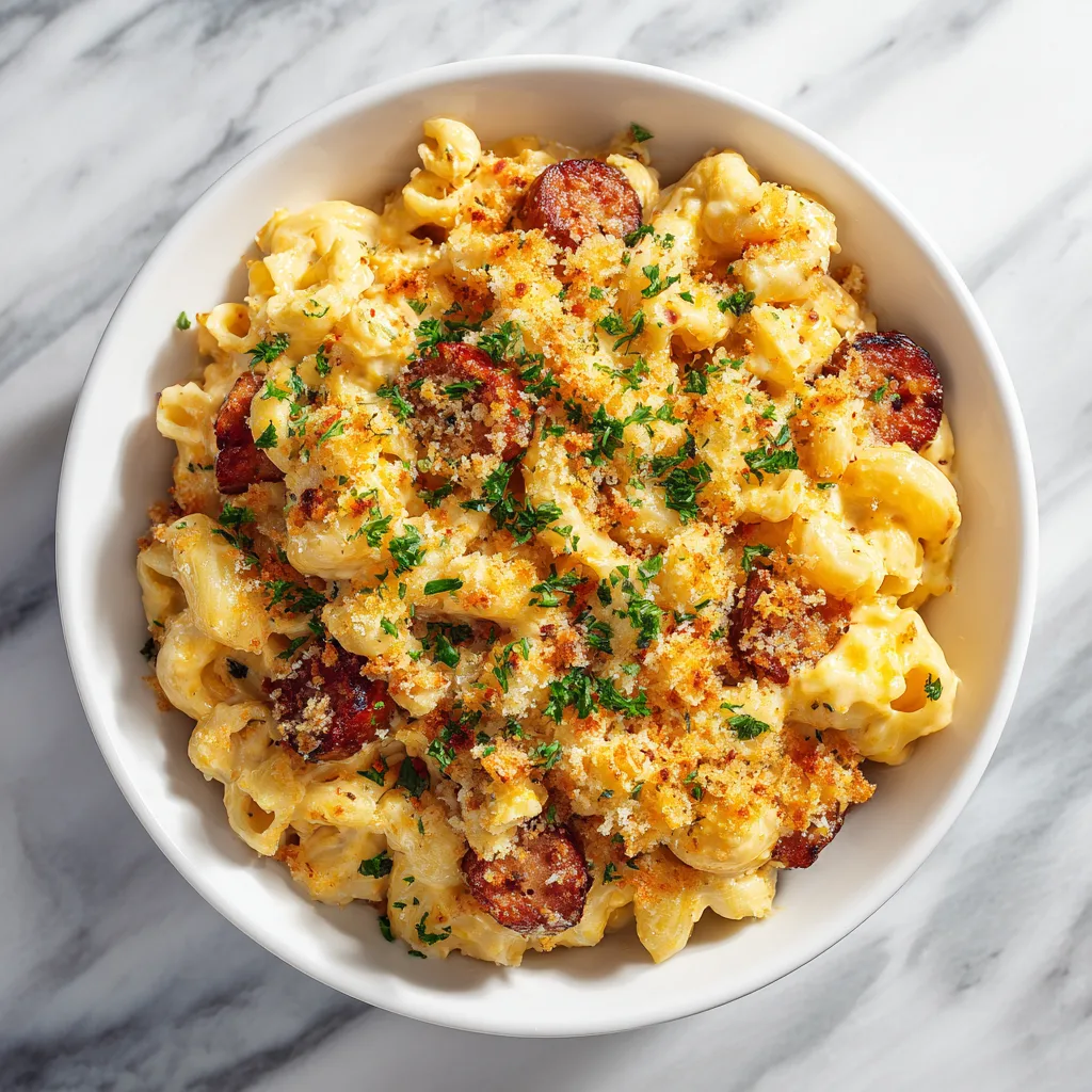 Add the cooked macaroni and seared Andouille sausage to the cheese sauce. Stir until everything is evenly coated. - Prepare the Topping (Optional):