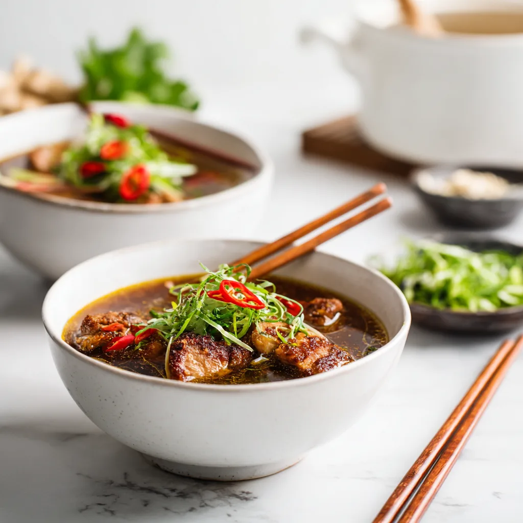 This recipe draws inspiration from several Asian culinary traditions where soy sauce and caramelisation play important roles in braising and soup-making. Dishes like soy-braised chicken and noodle soups often rely on similar techniques to create layered flavor.