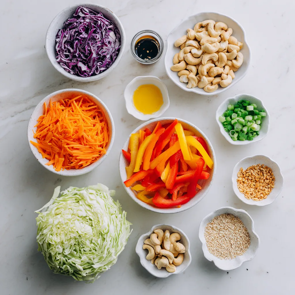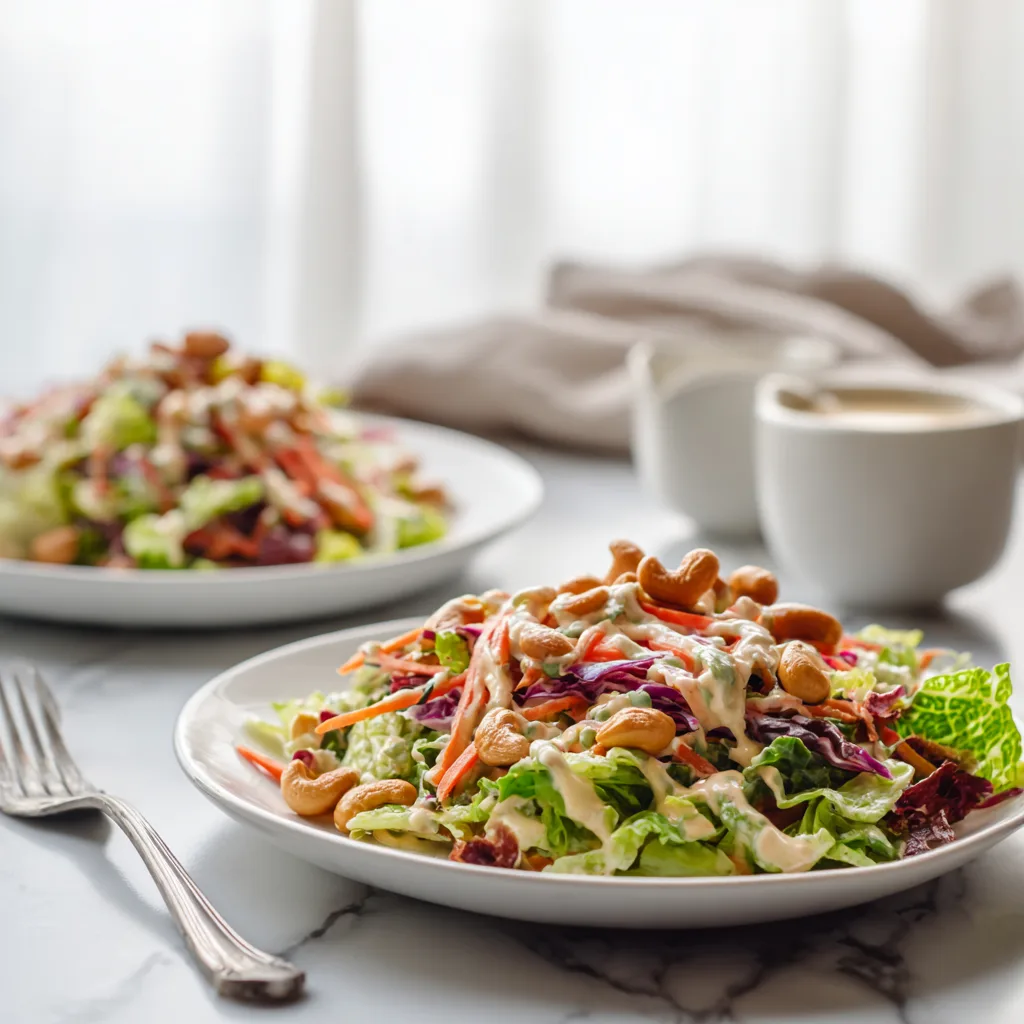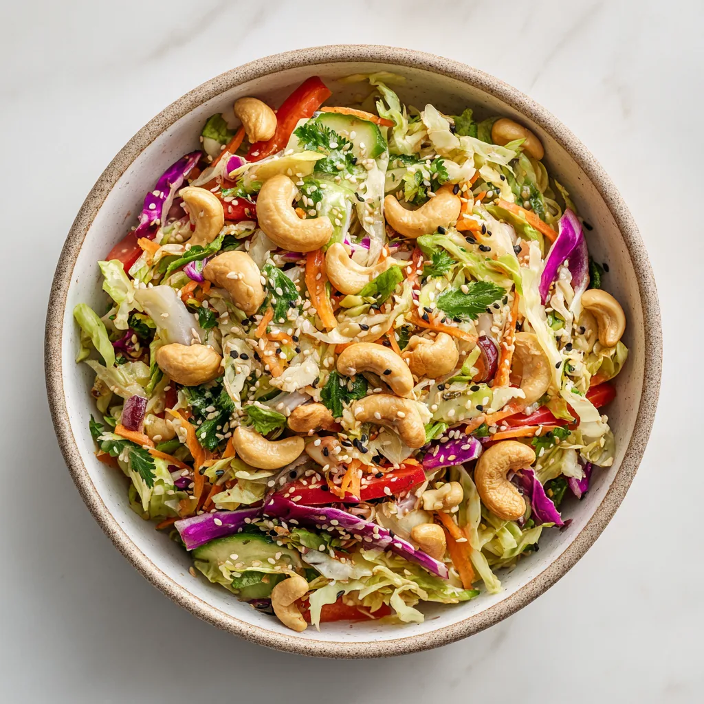 What makes this recipe stand out is its incredible crunch factor. Fresh cabbage, carrots, and peppers provide a crisp base, while roasted cashews add satisfying richness. The homemade sesame-style dressing ties everything together with bold flavor, making each bite irresistible.