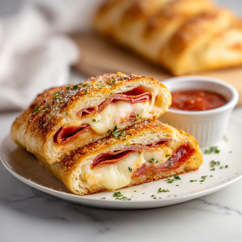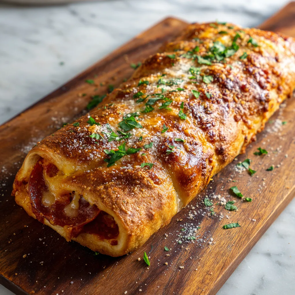 A golden, oven-baked stromboli filled with melted cheeses, pepperoni, and classic pizza flavors.