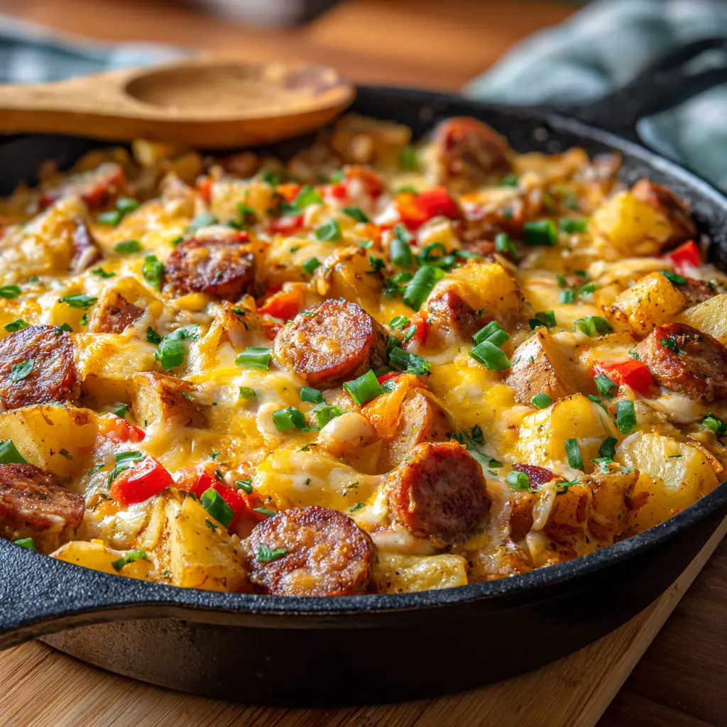 While this is definitely comfort food, it provides substantial nutrition with approximately 420 calories per serving. Potatoes offer vitamin C, potassium, and fiber for sustained energy. The sausage provides protein (about 18g per serving), while the cheese contributes calcium for bone health. The bell peppers add vitamin A and antioxidants. This hearty dish provides all the satisfaction of a complete meal in one pan.