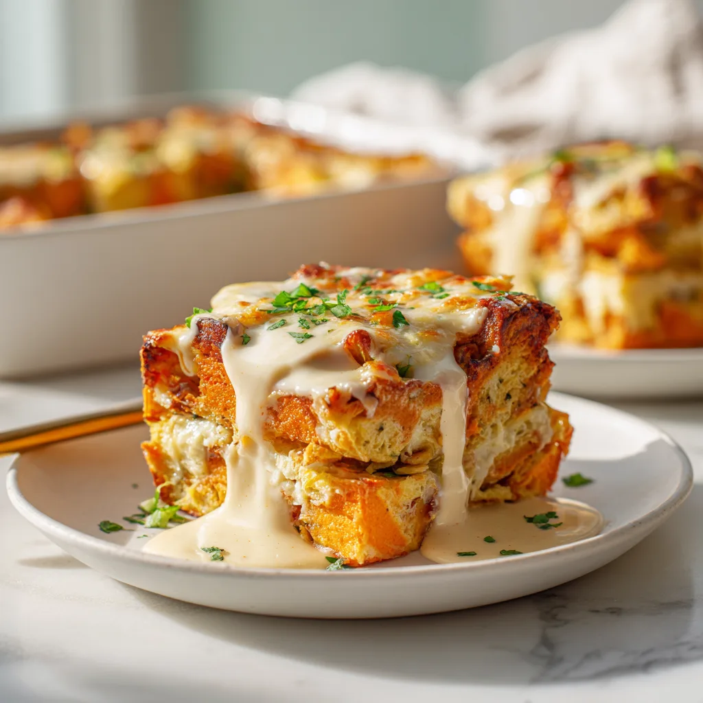 While the strata itself is satisfying on its own, the sauce takes it to another level. Creamy, savory, and lightly seasoned, the sauce ties all the flavors together and adds that “restaurant-worthy” finish. Drizzled over warm slices just before serving, it melts into the layers and makes every bite rich without being heavy.