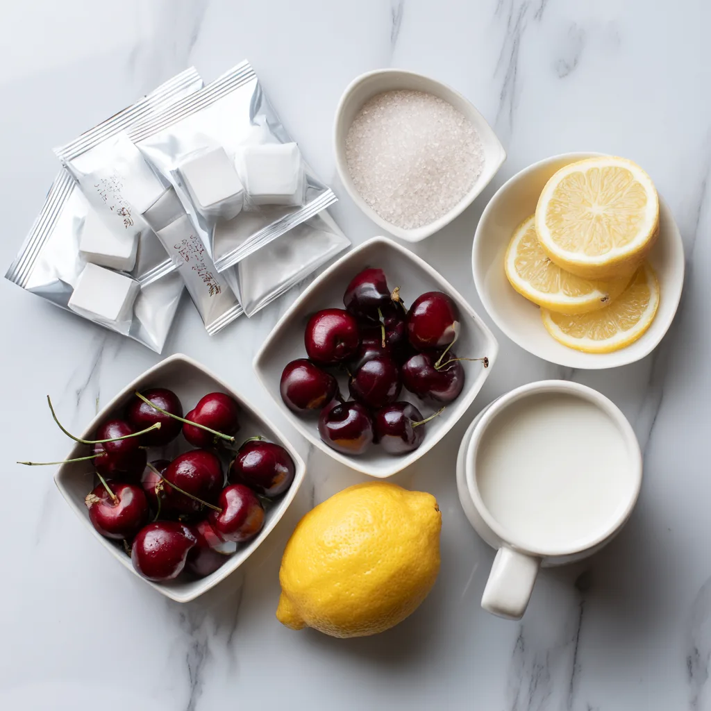- Cook cherries, sugar, lemon juice, and water in a saucepan for 8–10 minutes until syrupy. Strain and cool.