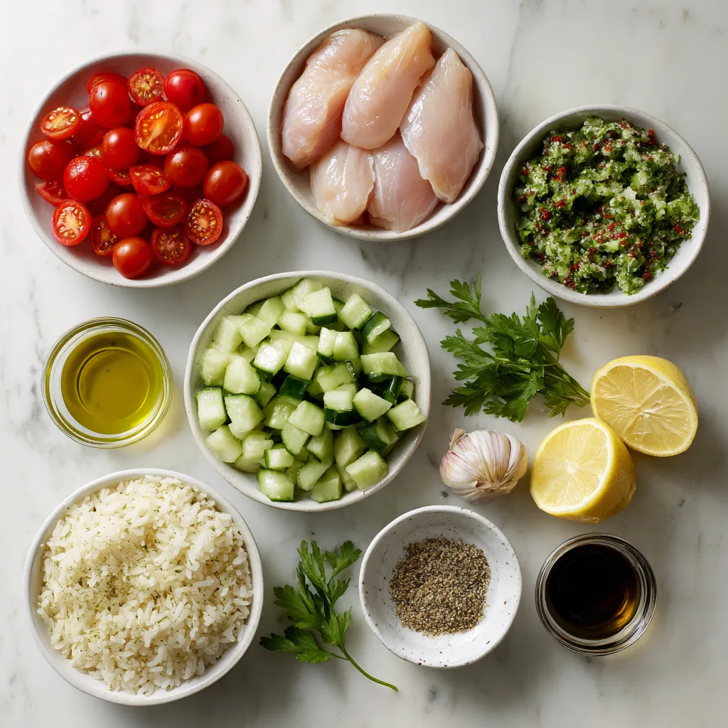 - Divide rice among bowls and top with chicken and tomato cucumber salad.