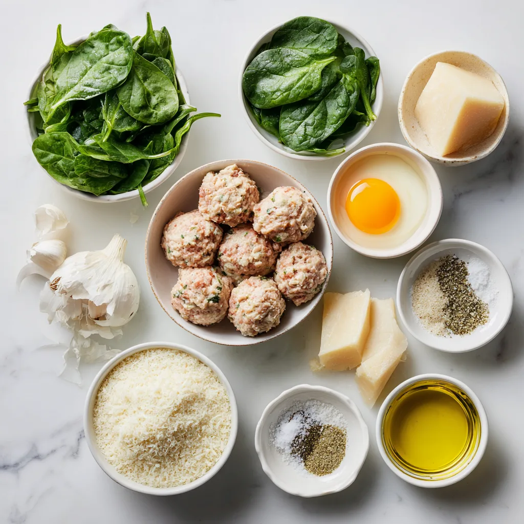 In a large mixing bowl, combine ground chicken, finely chopped spinach, Parmesan cheese, breadcrumbs, egg, minced garlic, Italian seasoning, salt, and pepper. Mix gently until just combined. Avoid overmixing to keep the meatballs tender.