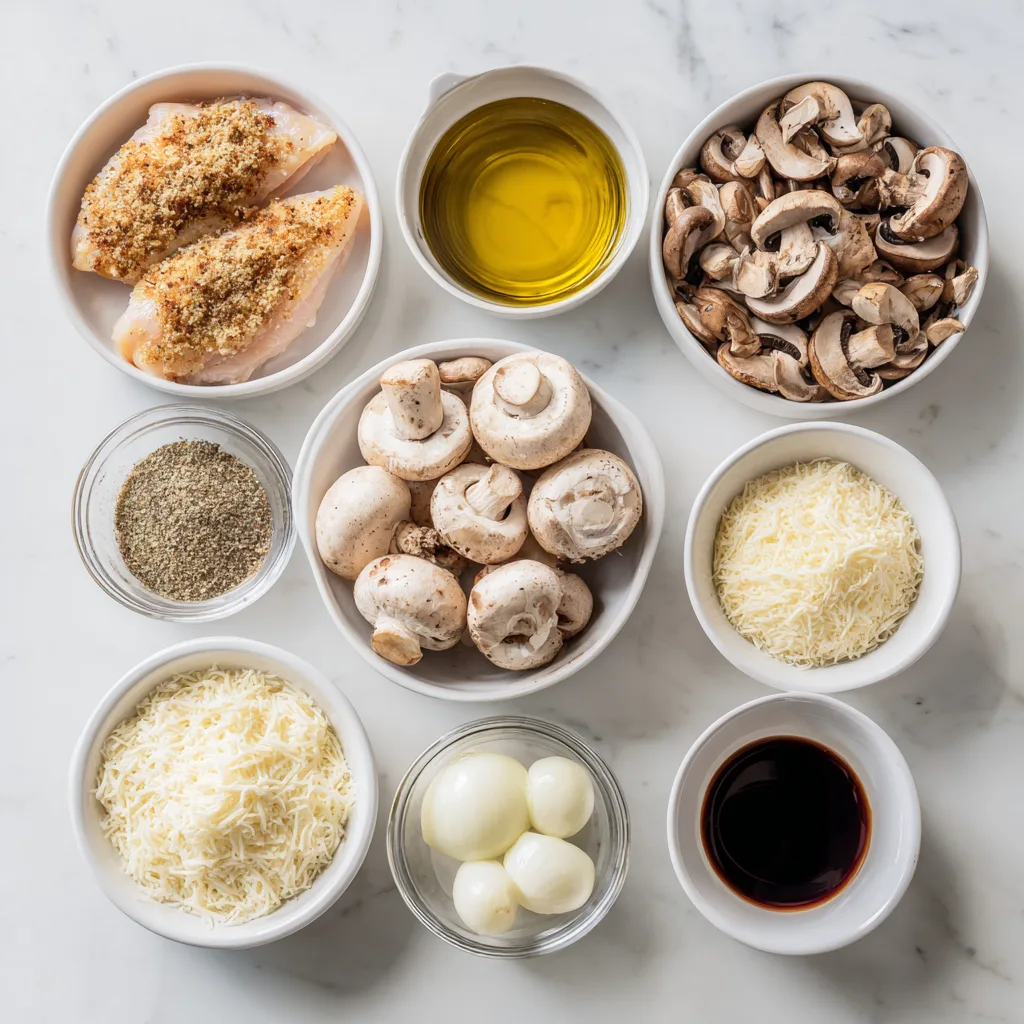 - Assemble casserole: Pour mushroom-Marsala sauce over chicken in the casserole dish. Top with mozzarella, Parmesan, and breadcrumbs evenly.