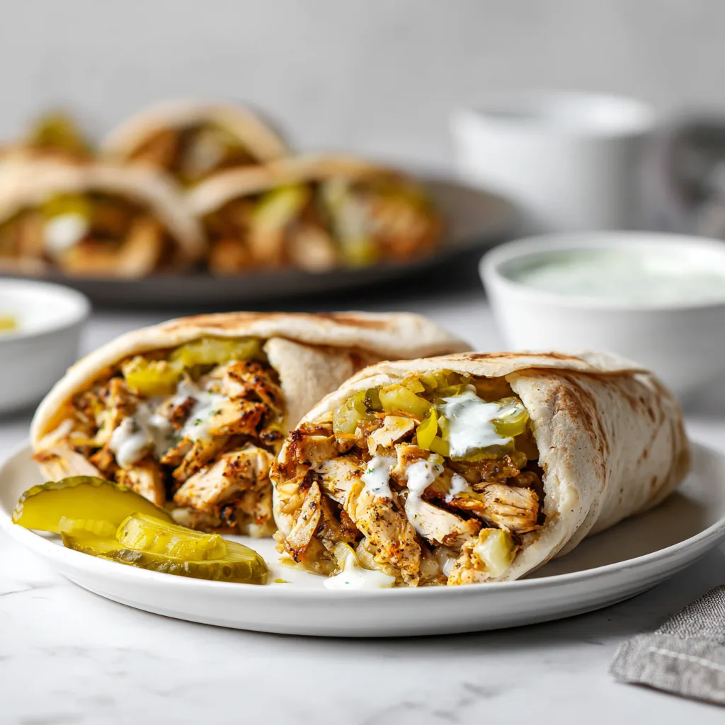 - Wrapped in pita with garlic sauce, pickles, and tomatoes