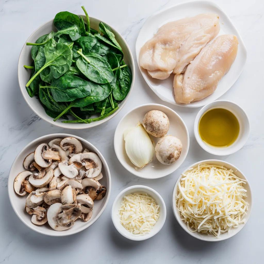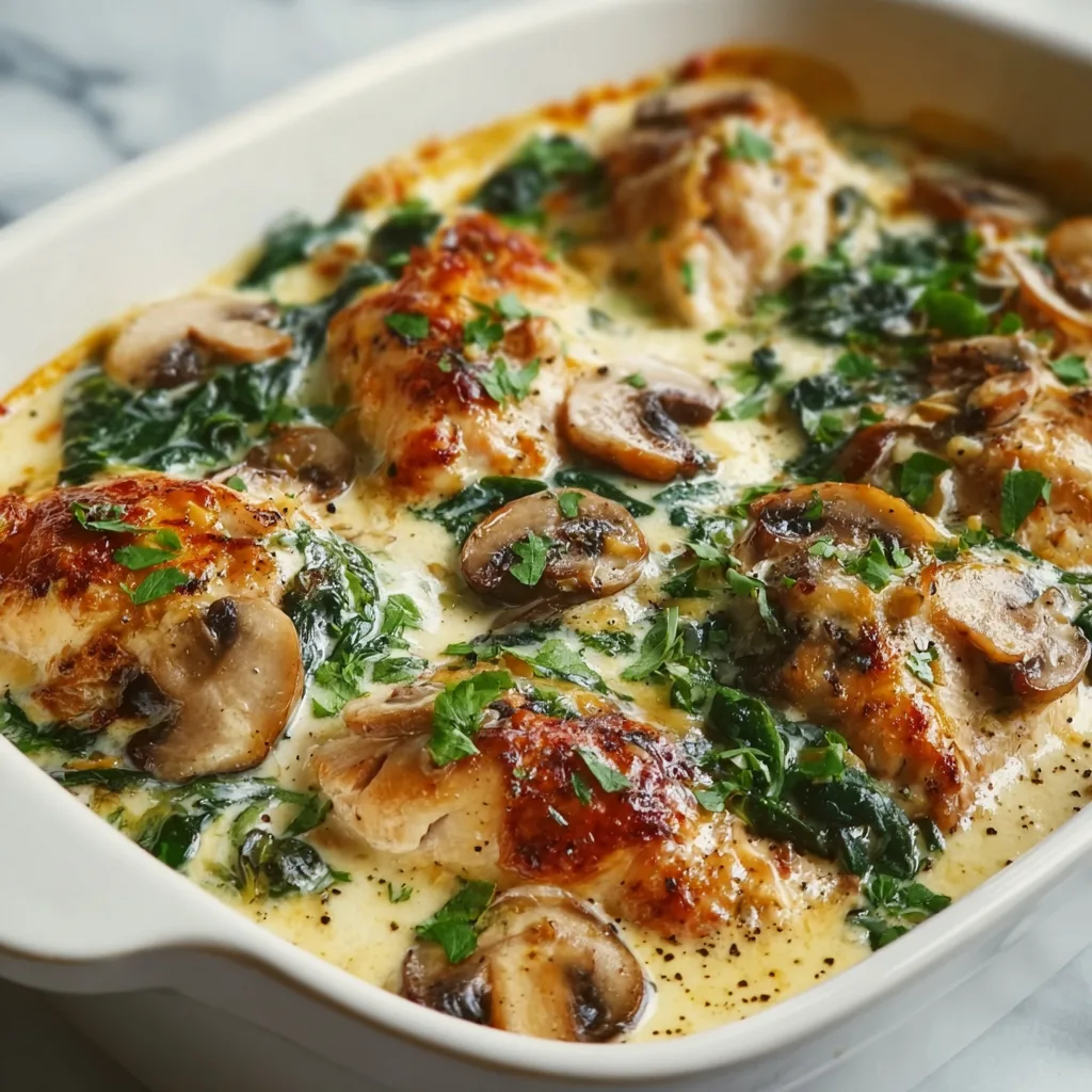 Arrange the seared chicken breasts in the baking dish. Pour the creamy mushroom-spinach mixture over the top. Sprinkle with mozzarella and remaining Parmesan. - Bake:
