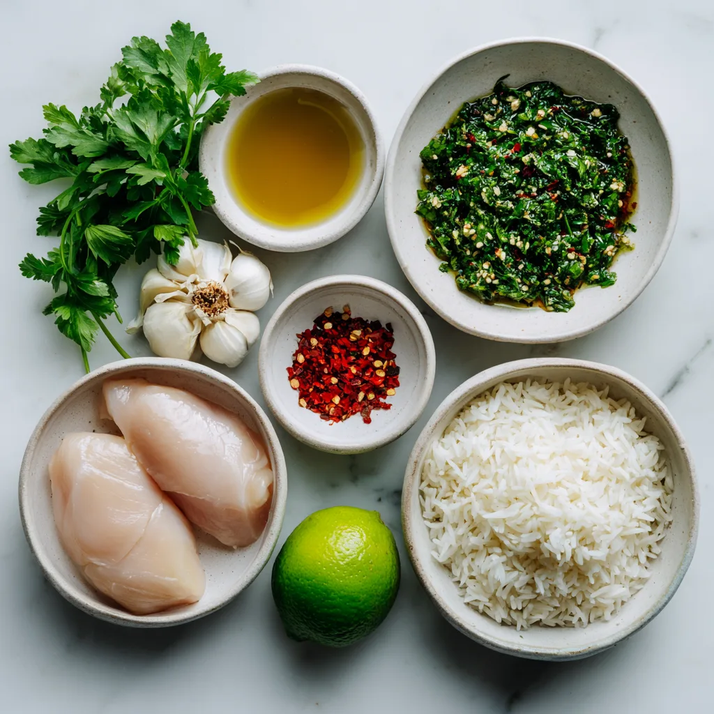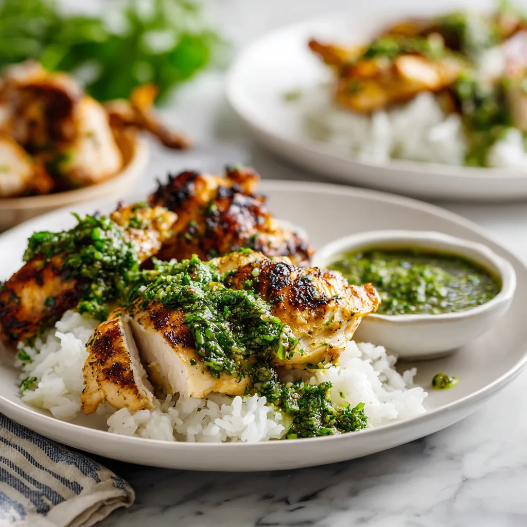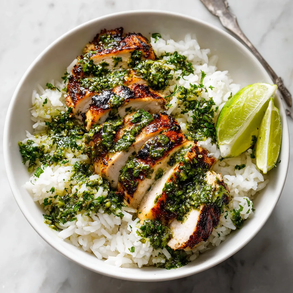 A vibrant, flavorful bowl featuring garlic-marinated grilled chicken, fluffy rice, and zesty chimichurri sauce — a quick and healthy weeknight dinner favorite.