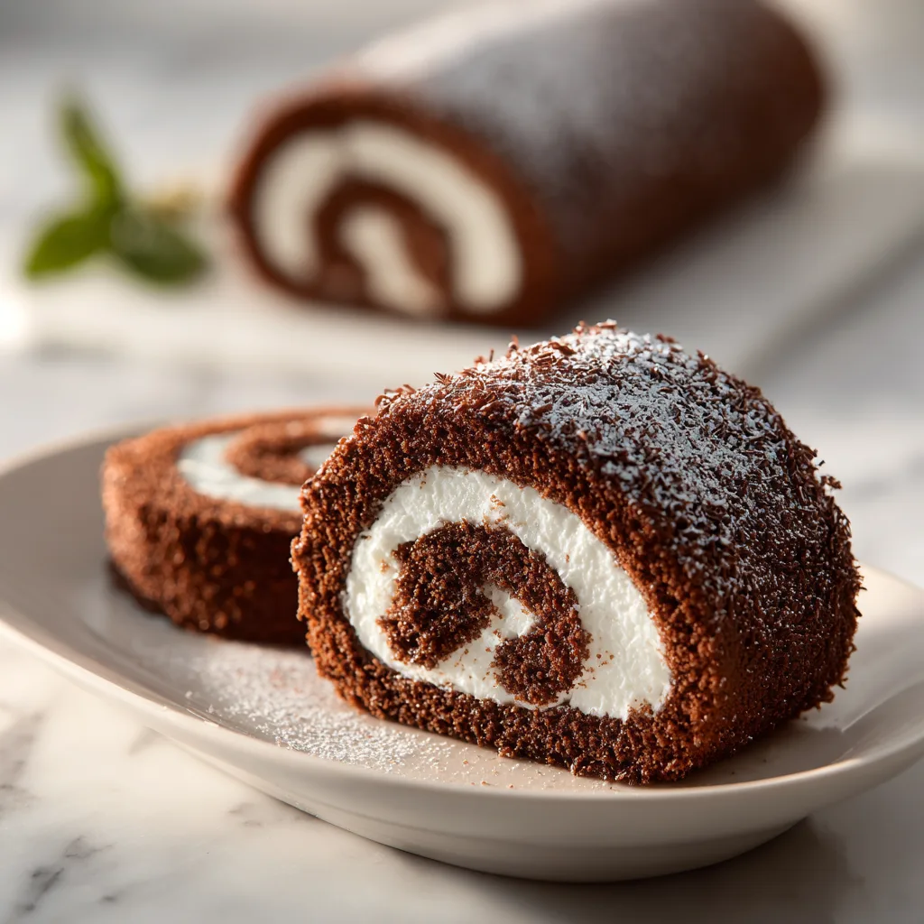 A soft, rich chocolate sponge cake rolled with whipped cream filling for an elegant and delicious dessert.