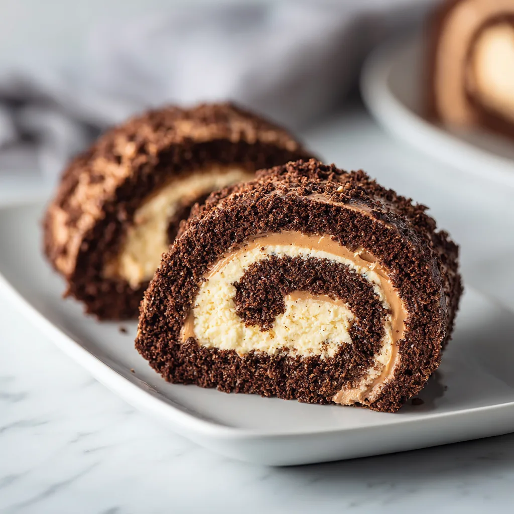 A soft chocolate sponge cake rolled with a creamy peanut butter filling, creating a rich and elegant dessert.