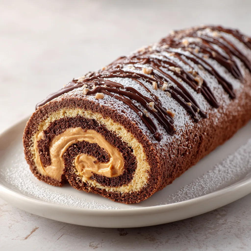 A soft chocolate sponge cake rolled with creamy peanut butter filling and finished with a drizzle of chocolate for an irresistible dessert.