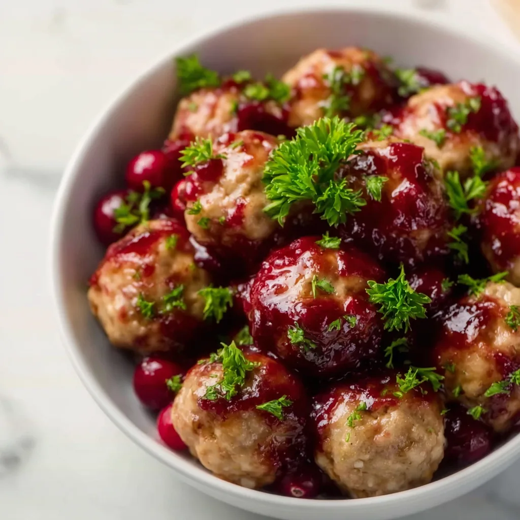 - Serve and Garnish: Transfer meatballs to a serving platter, garnish with fresh parsley and whole cranberries, and serve warm.