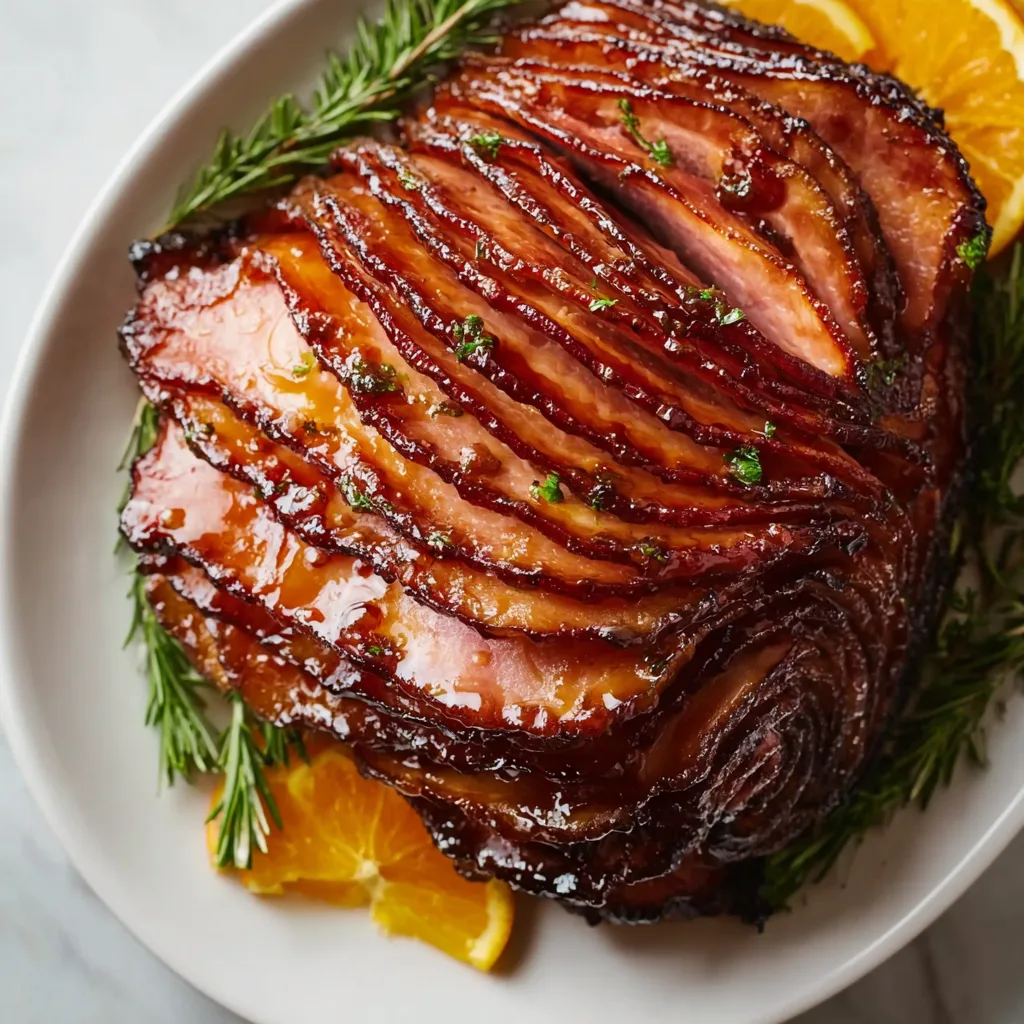 Remove the ham from the oven and let it rest for 10 minutes before slicing. Garnish with fresh rosemary and orange slices for a festive presentation.
