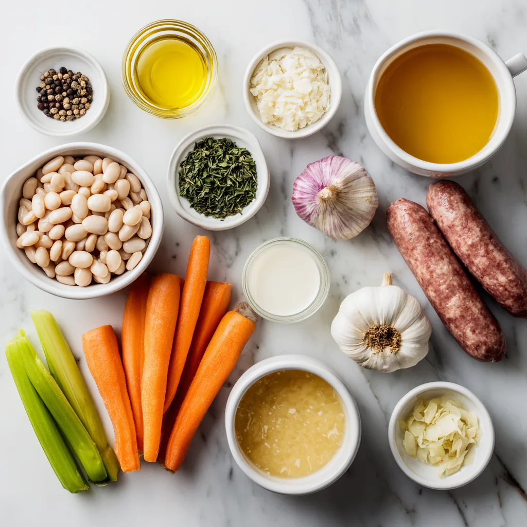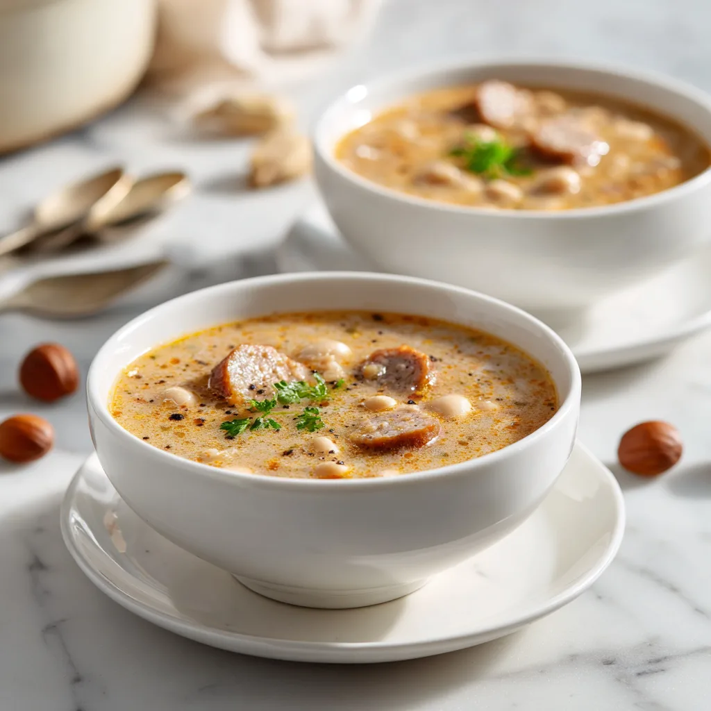 A rich, comforting, creamy bean soup filled with savory sausage, tender vegetables, and warming herbs.