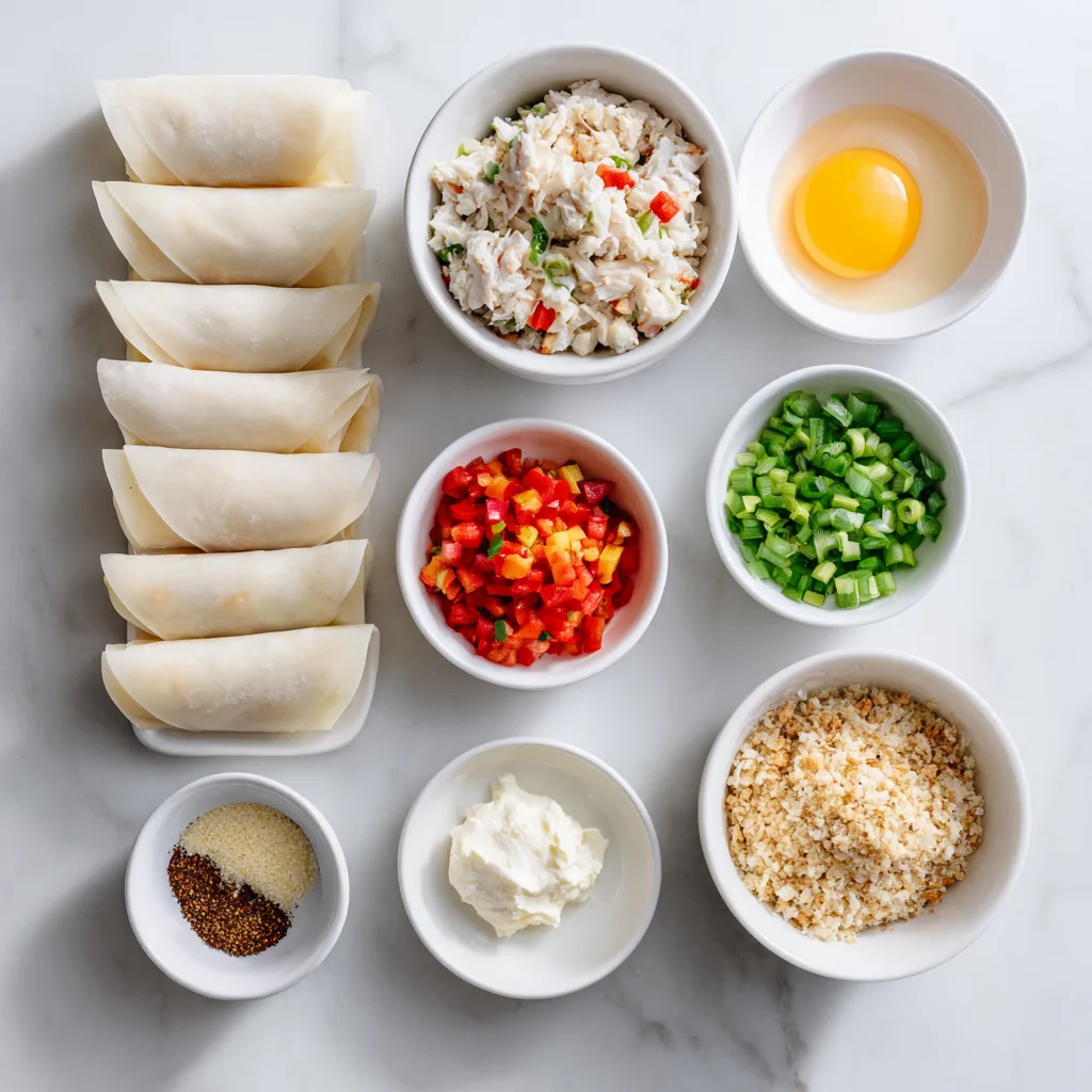 A crispy, creamy fusion of crab cakes and egg rolls — golden fried perfection with savory seafood flavor.