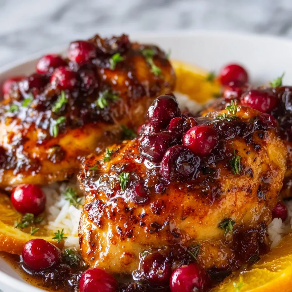 - Serve and garnish: Transfer chicken to plates, spoon extra glaze over the top, and garnish with fresh cranberries and orange slices.