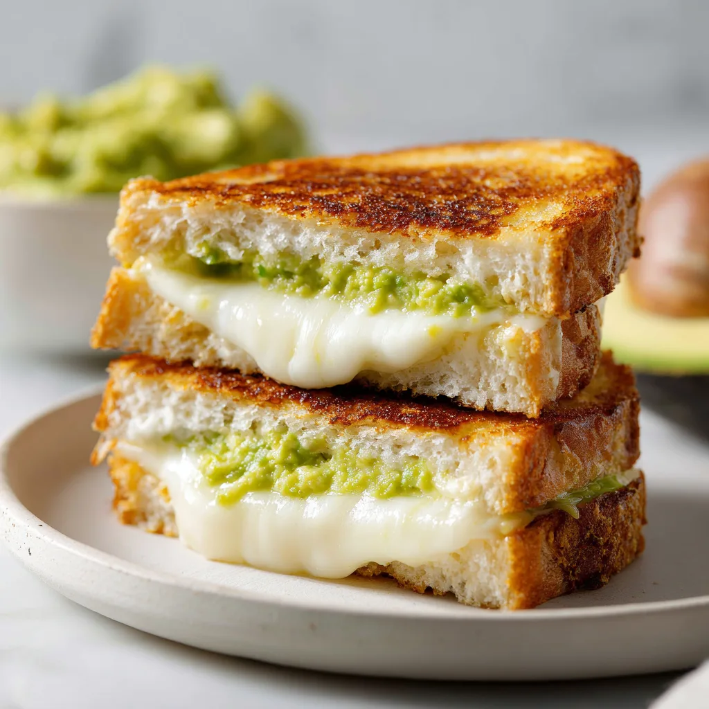 A rich and comforting grilled cheese sandwich layered with creamy avocado and perfectly melted cheese.