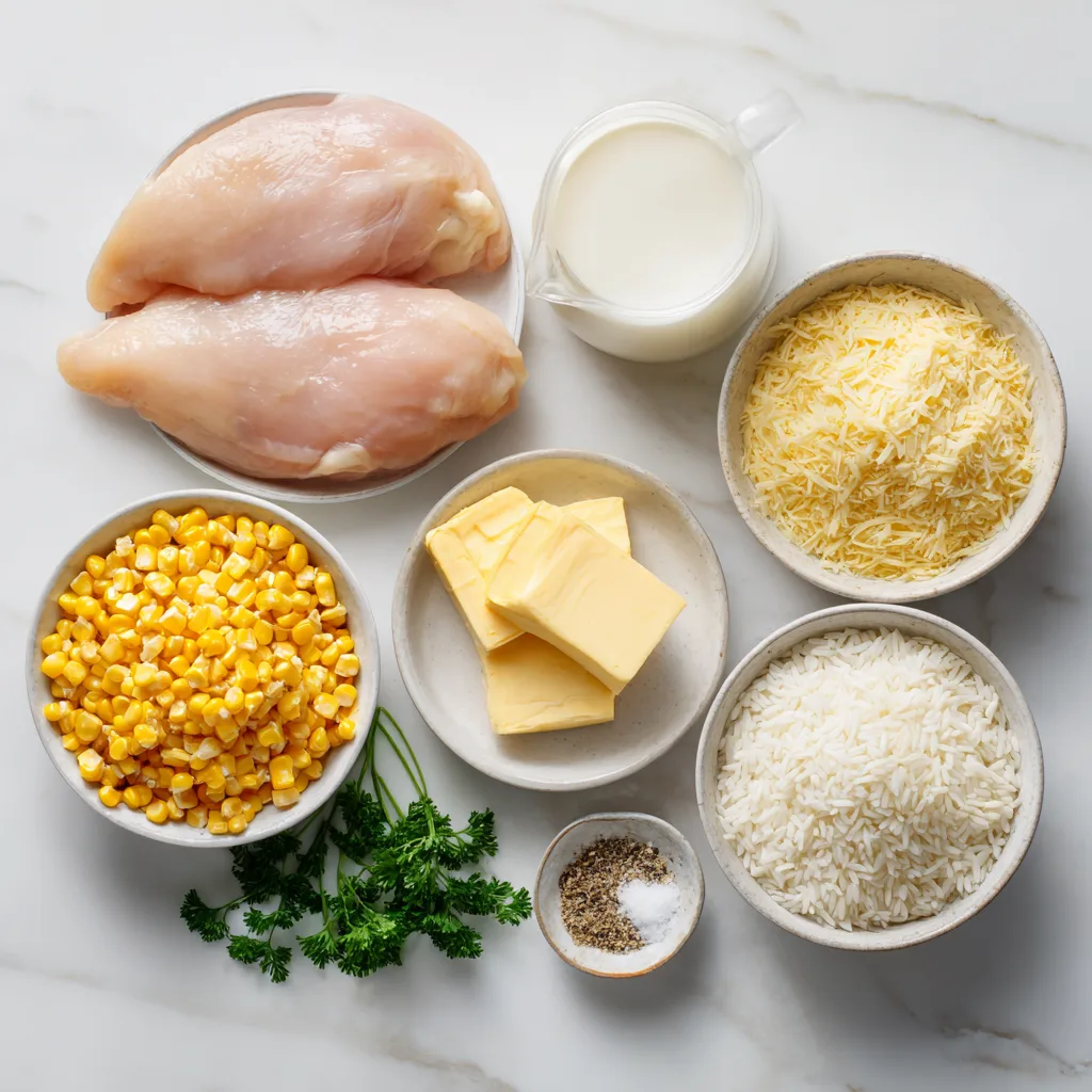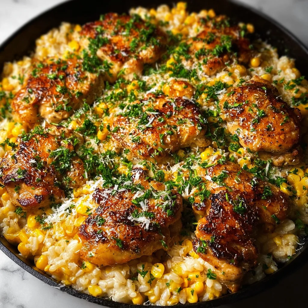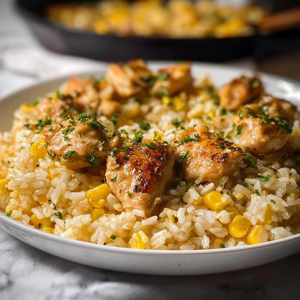 A creamy, one-pan meal combining juicy chicken, sweet corn, and rich garlic parmesan rice for the ultimate comfort food experience.