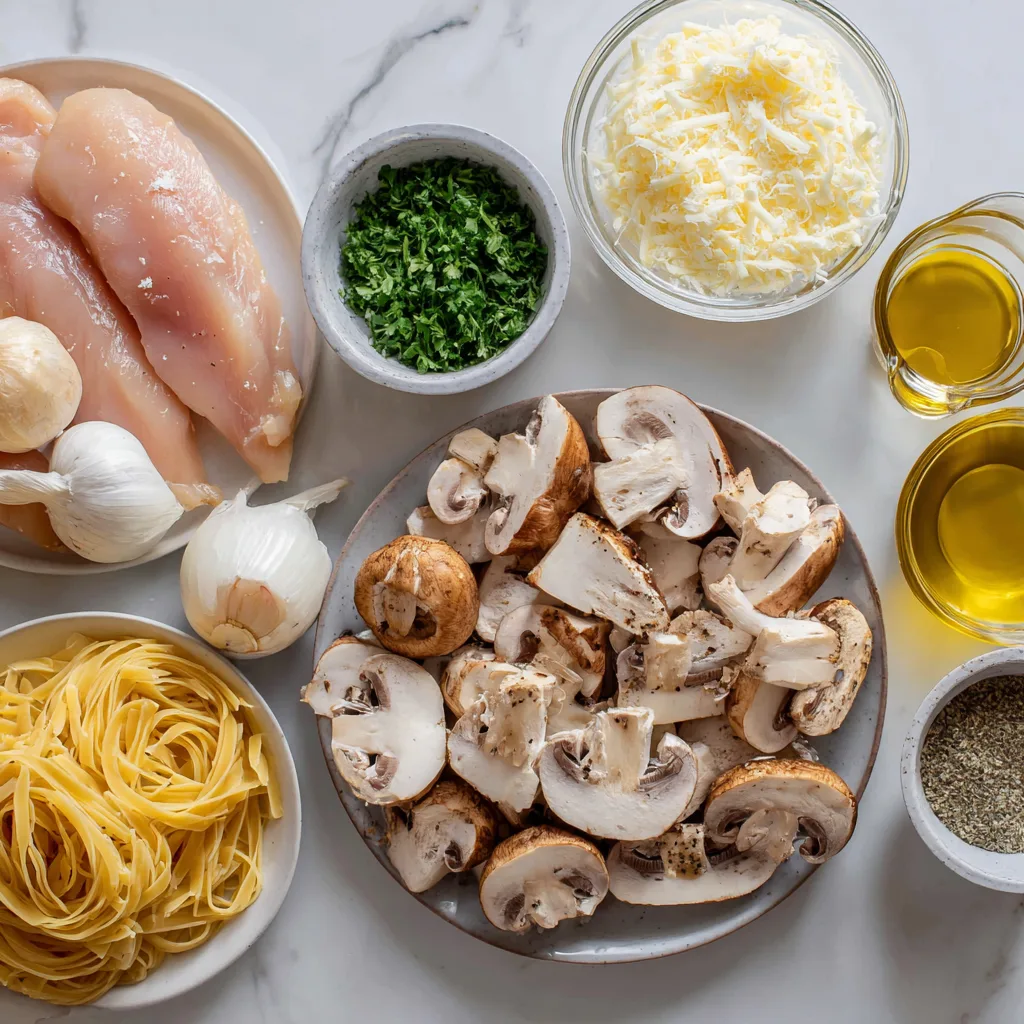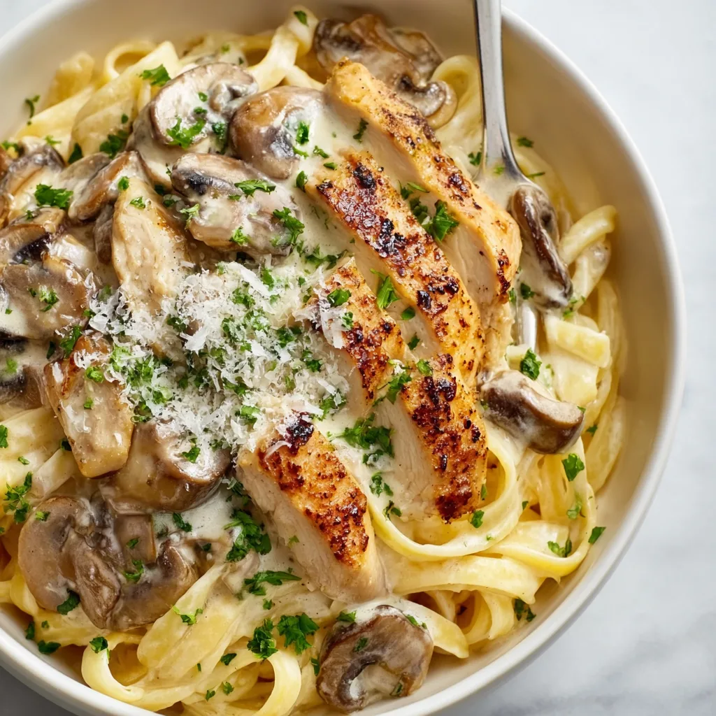 Tender chicken and sautéed mushrooms tossed in a rich garlic cream sauce with Parmesan — a comforting, one-pan pasta perfect for weeknights.