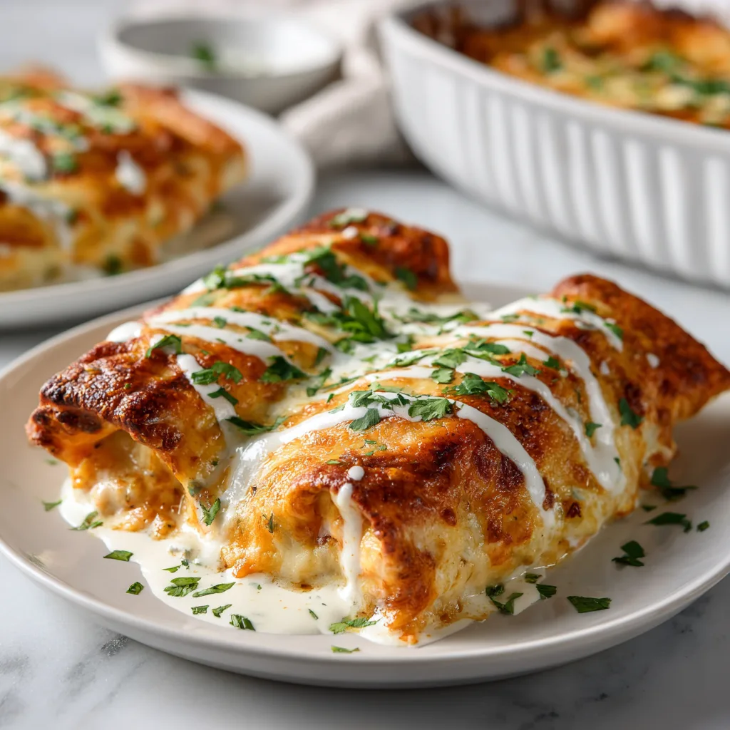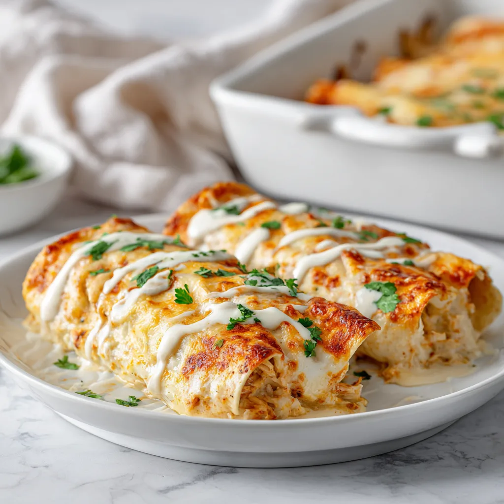 A rich, comforting enchilada recipe featuring tender chicken wrapped in soft tortillas and topped with a creamy sour cream white sauce.
