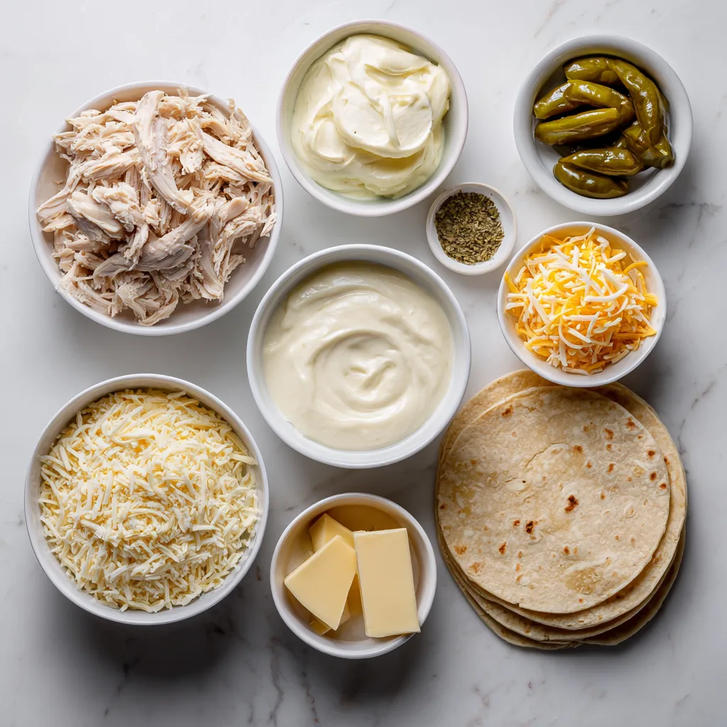 2. Prepare the chicken filling by combining shredded chicken, 1½ cups cheese, green chiles, garlic powder, onion powder, cumin, salt, and pepper. Mix until smooth and evenly coated.