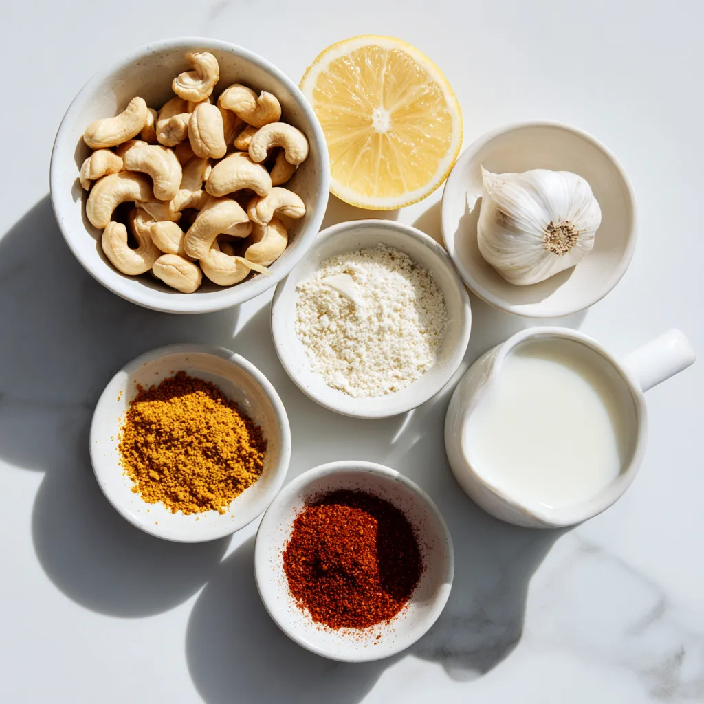 - Add cashews, garlic, nutritional yeast, lemon juice, and plant milk to a blender.
