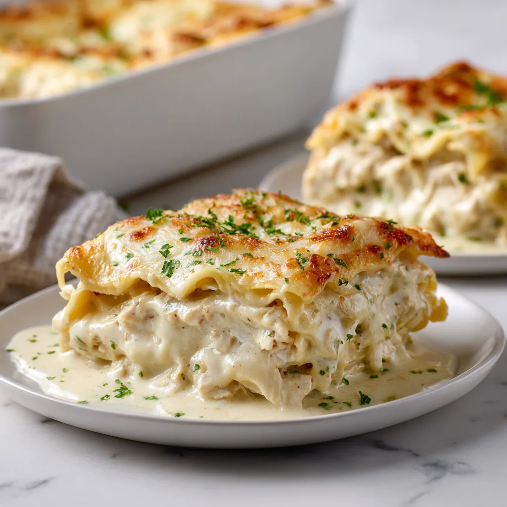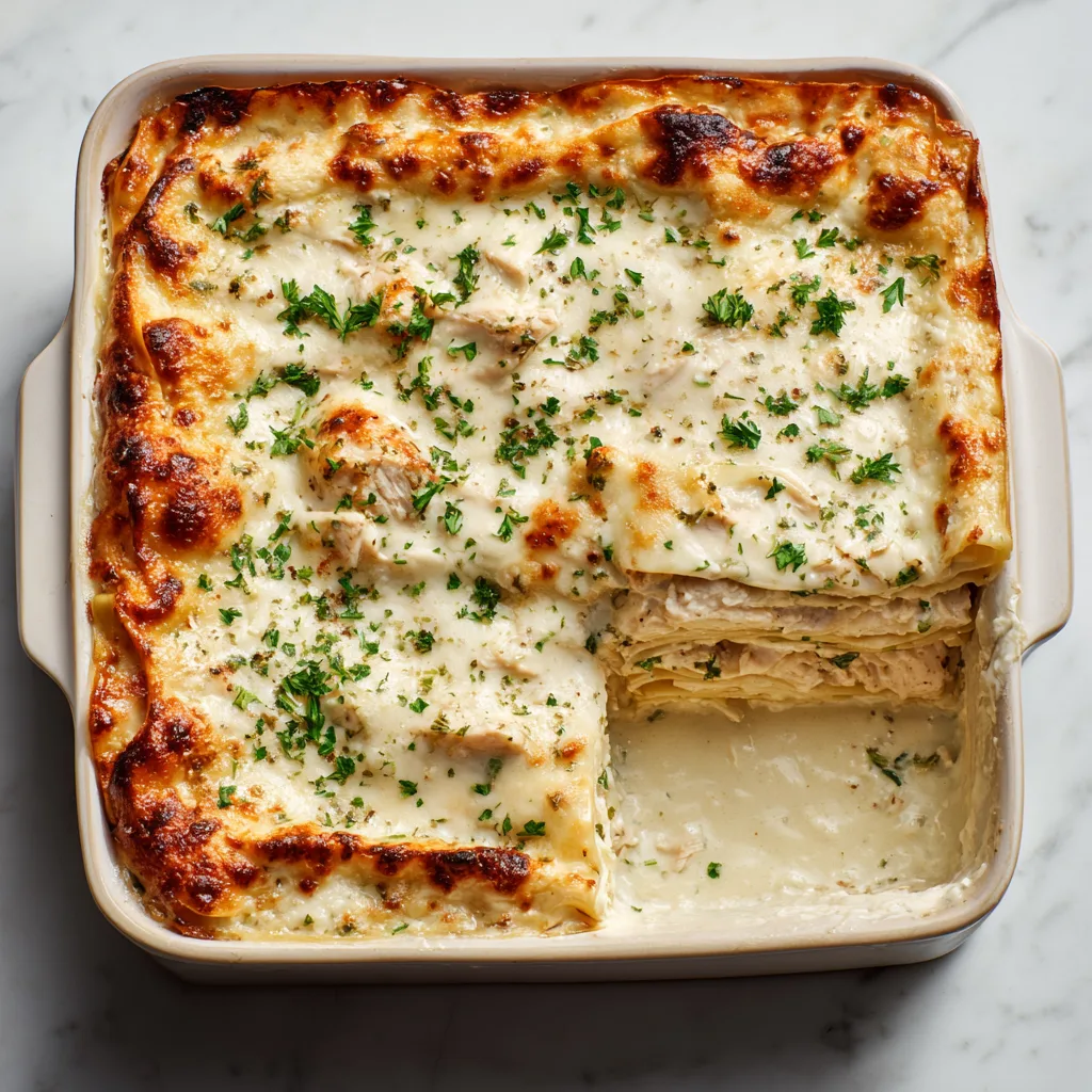 A rich and comforting chicken lasagna layered with creamy white sauce, tender pasta, and melted cheese.