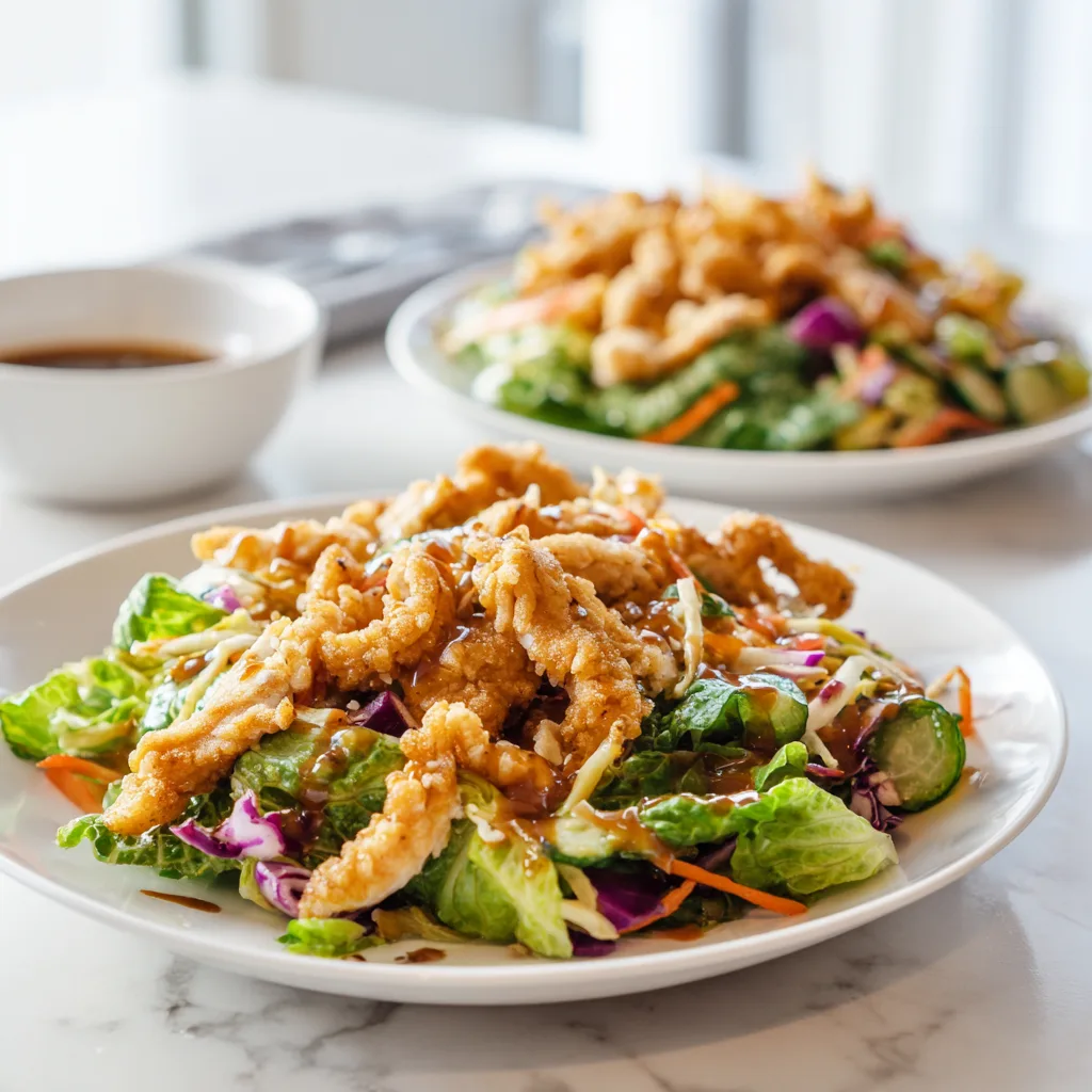 A vibrant and crunchy salad featuring crispy chicken, fresh vegetables, and a flavorful sesame dressing.