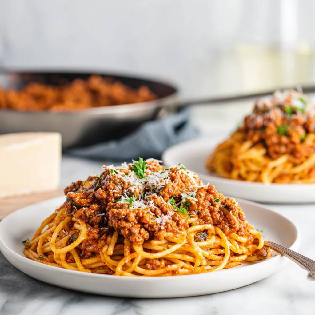 The meat sauce is intentionally hearty, made with ground beef (or a beef and pork blend) and simmered long enough to develop depth. When spooned generously over spaghetti and topped with eggplant and cheese, it transforms a simple pasta into a full, comforting meal.