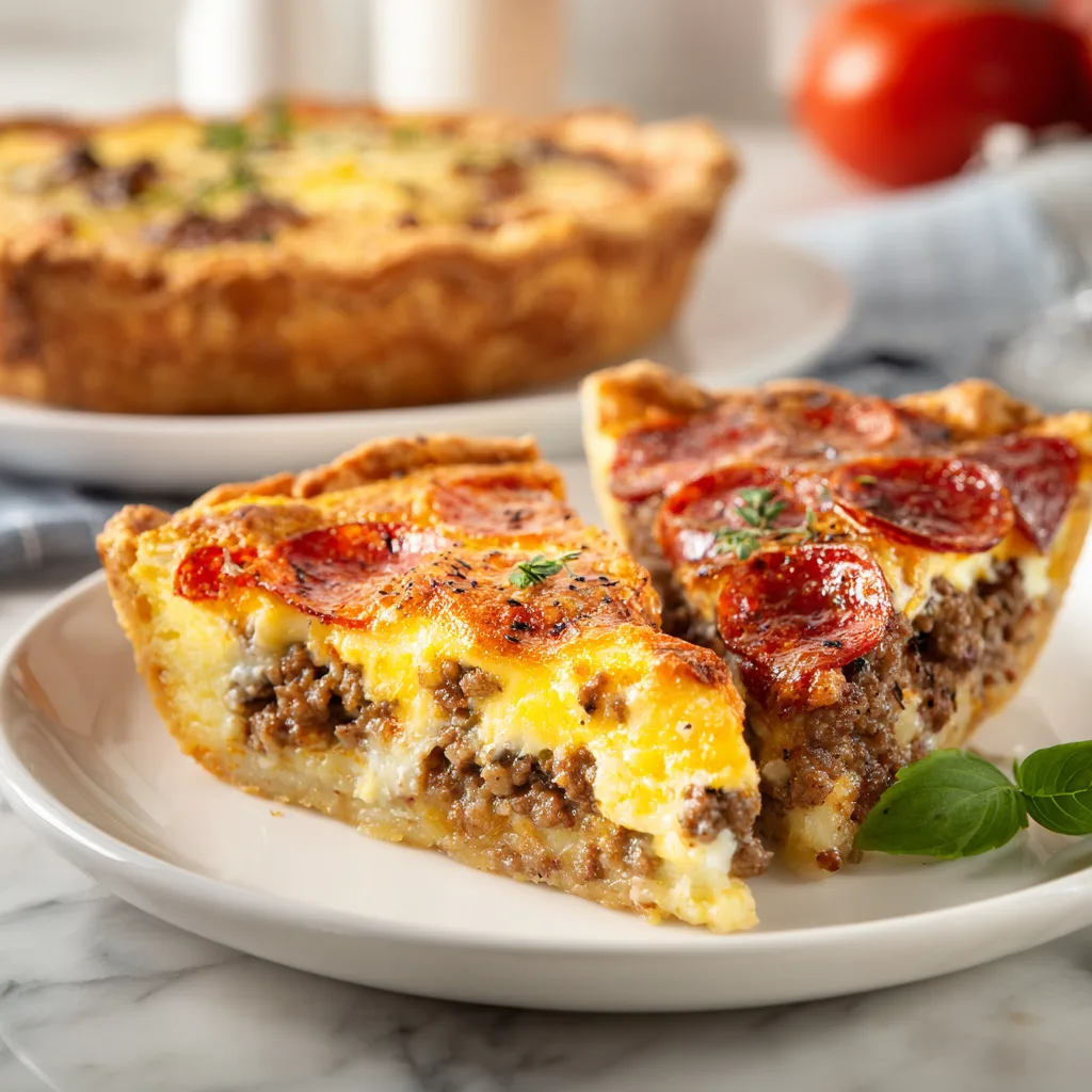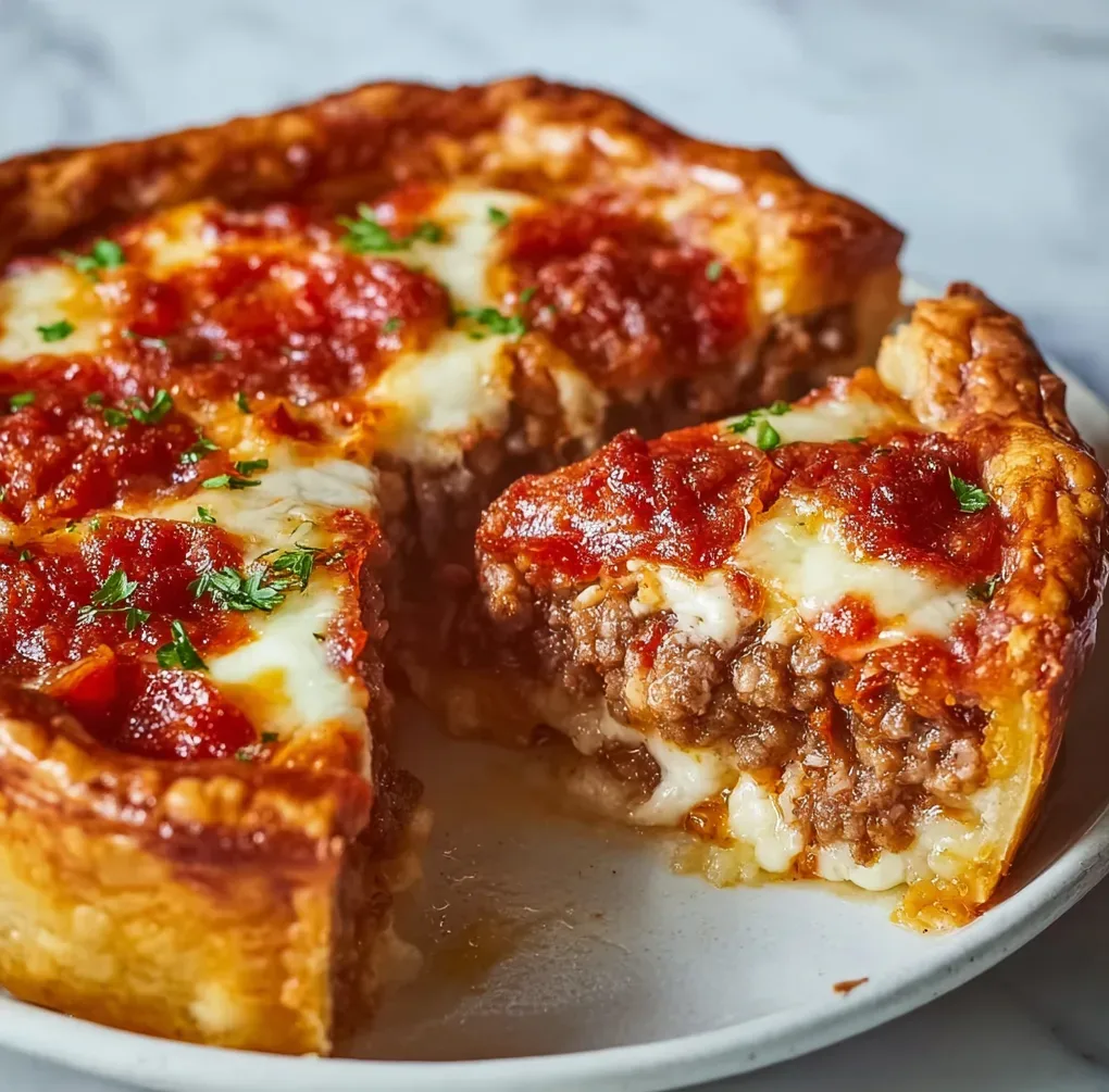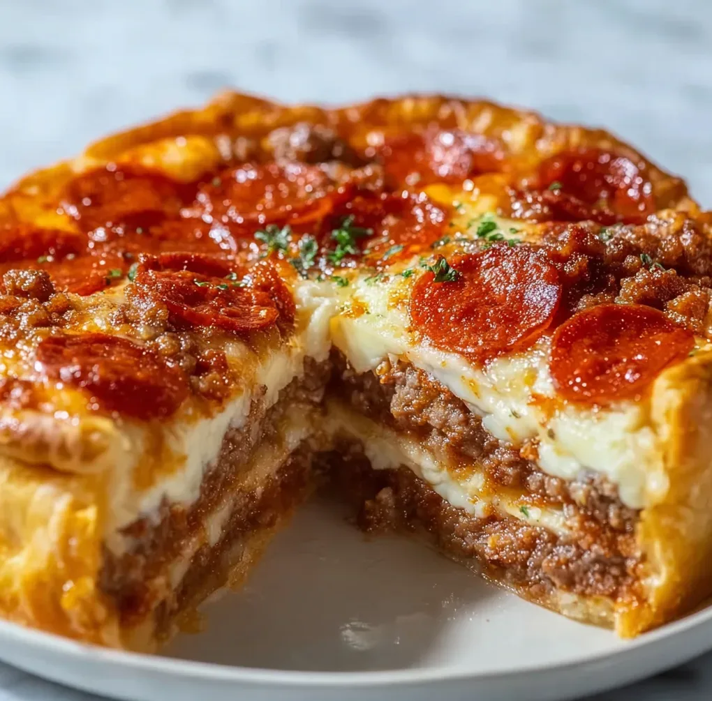 A hearty deep-dish savory pie layered with ground beef, Italian sausage, pepperoni, cheese, and rich pizza sauce, all baked inside a golden flaky crust.