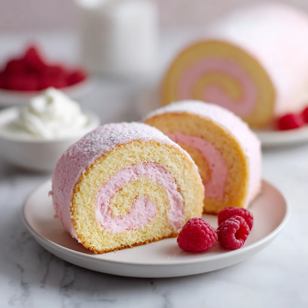 A soft, fluffy pink sponge cake rolled with a light whipped cream filling, perfect for elegant desserts and special occasions.