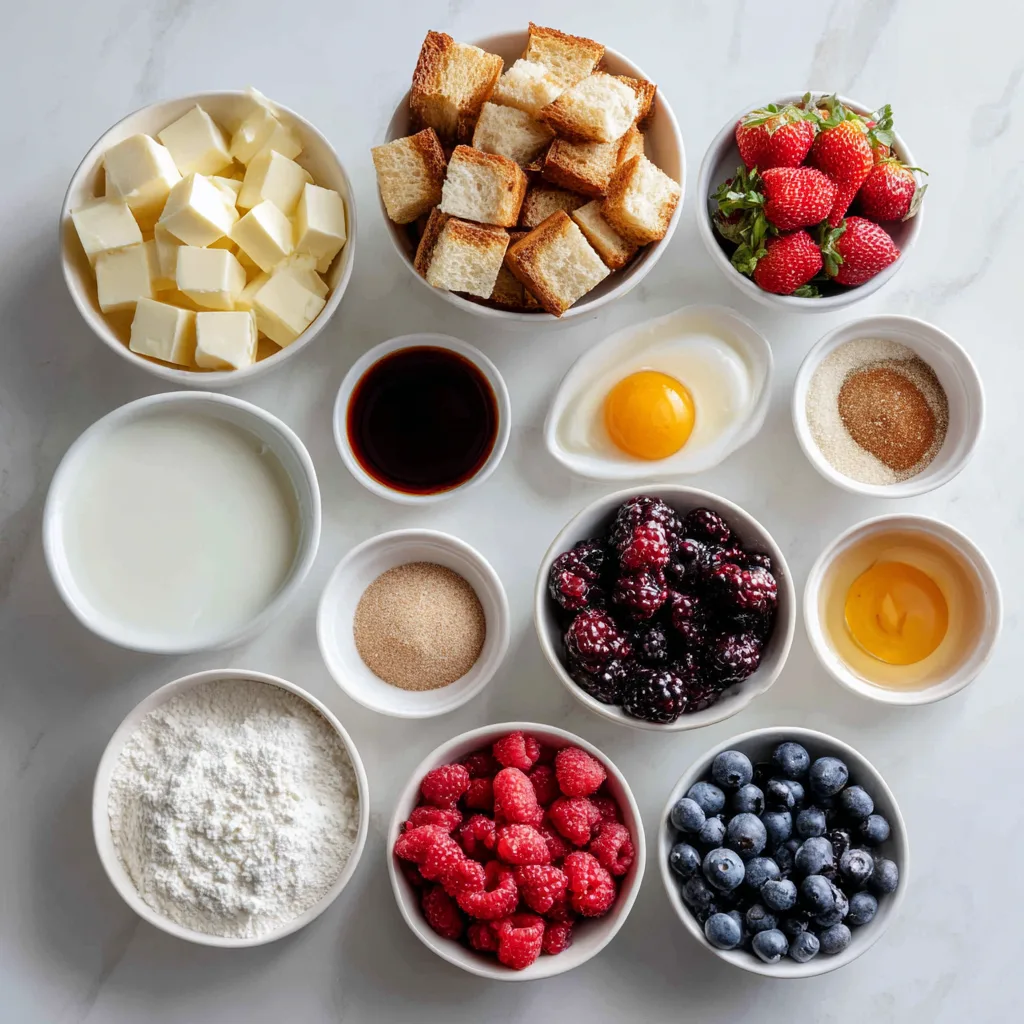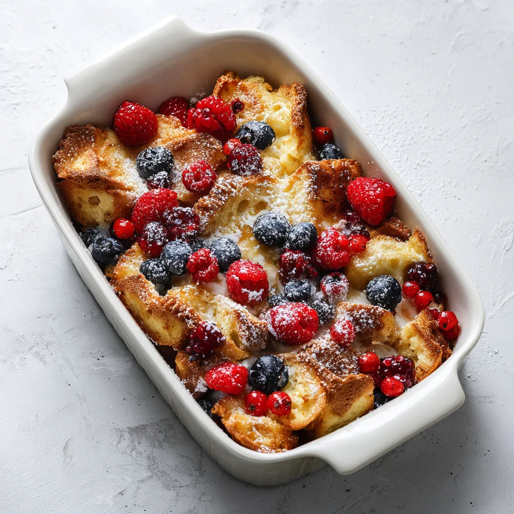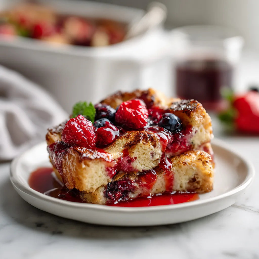 This baked French toast casserole combines soft cubes of bread soaked in a rich vanilla-cinnamon custard, layered with juicy berries, and baked until golden and lightly crisp on top. The result is creamy in the center, slightly crunchy around the edges, and bursting with fruity flavor in every bite.