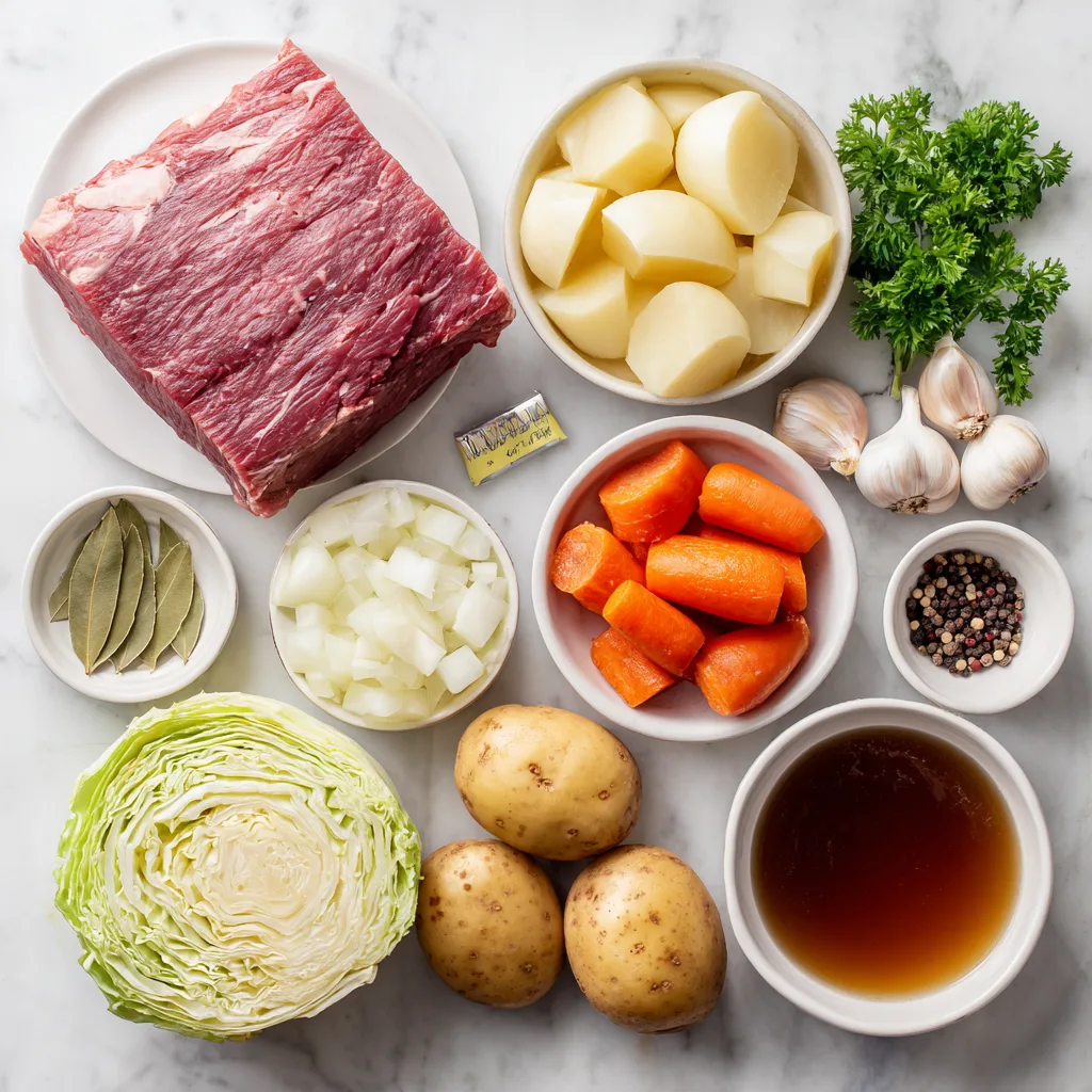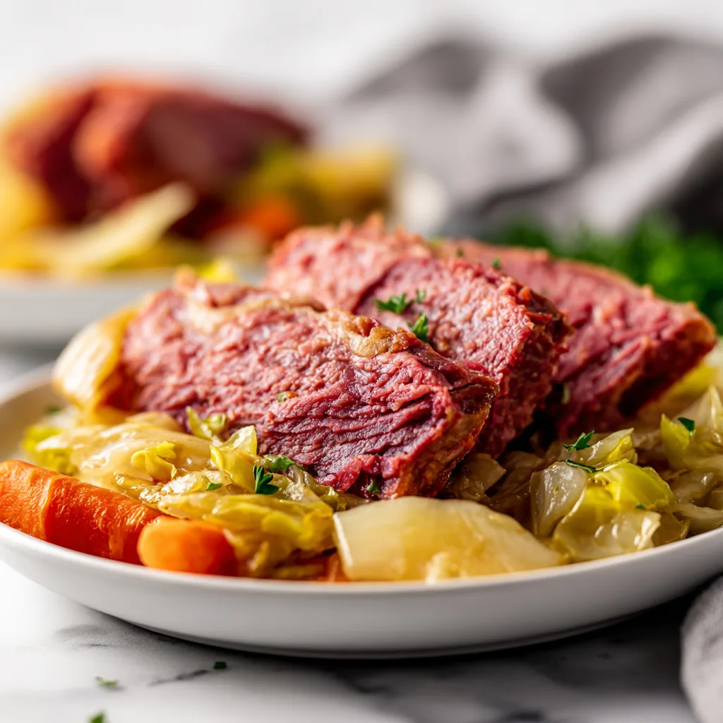Tender slow-cooked corned beef brisket with cabbage, potatoes, and carrots in a flavorful broth.
