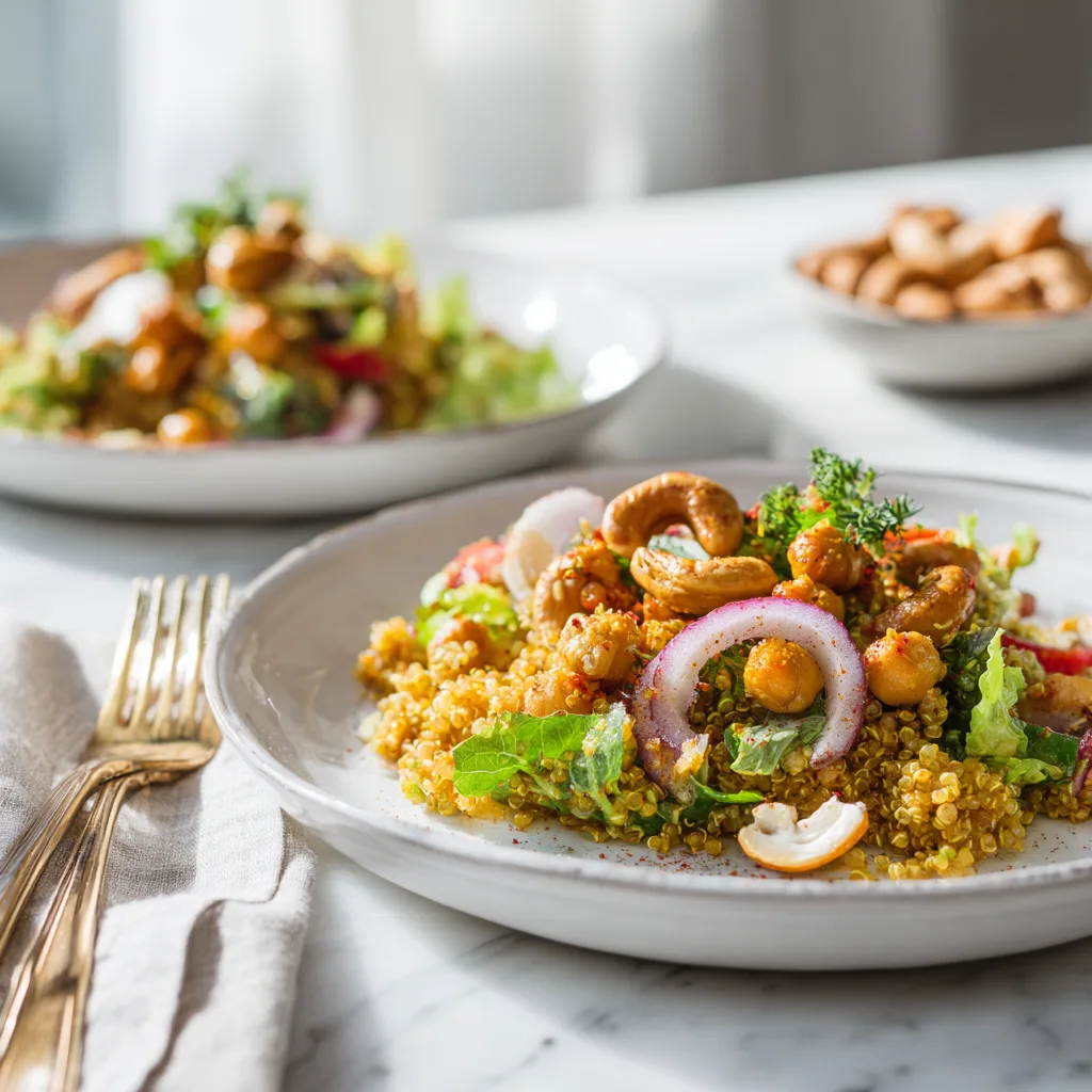 If you’re craving a salad that is bold, nourishing, and deeply satisfying, Easy Curry Chickpea Quinoa Salad with Maple Cayenne Cashews delivers everything you want in one vibrant bowl. This is not a boring side salad or an afterthought lunch—it’s a flavor-packed, protein-rich, plant-based meal that stands confidently on its own.