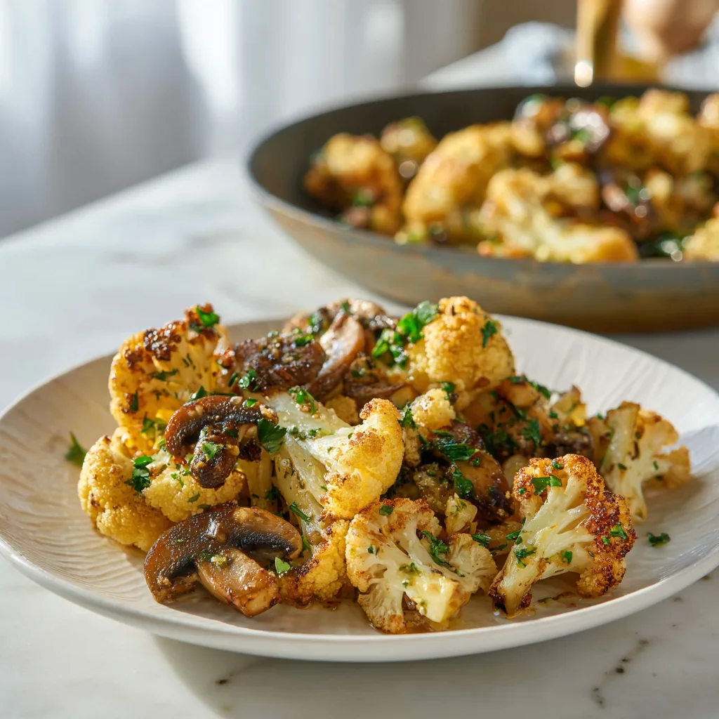The combination of roasted cauliflower and sautéed mushrooms creates a satisfying texture contrast—crispy edges with soft, buttery interiors.