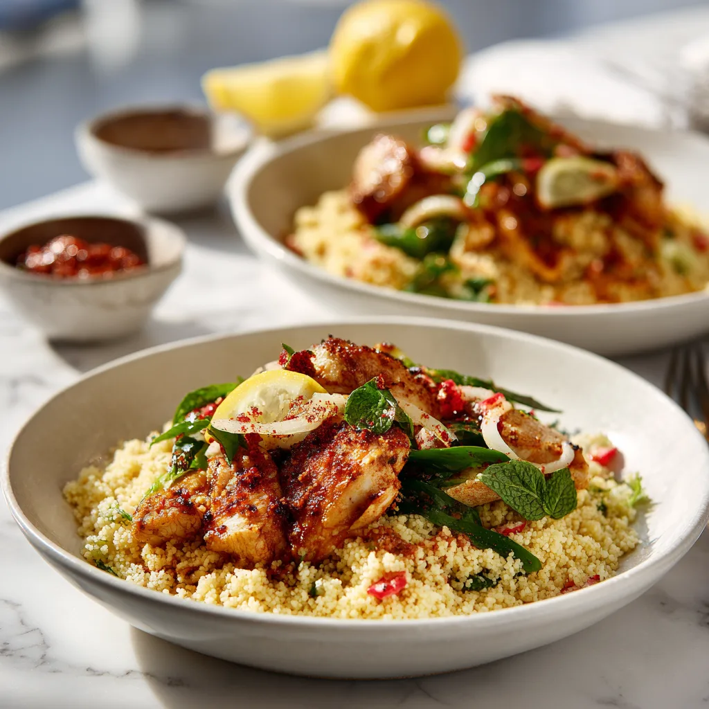 A flavorful Moroccan-inspired dinner featuring spiced chicken, fluffy couscous, vegetables, and warm North African spices.