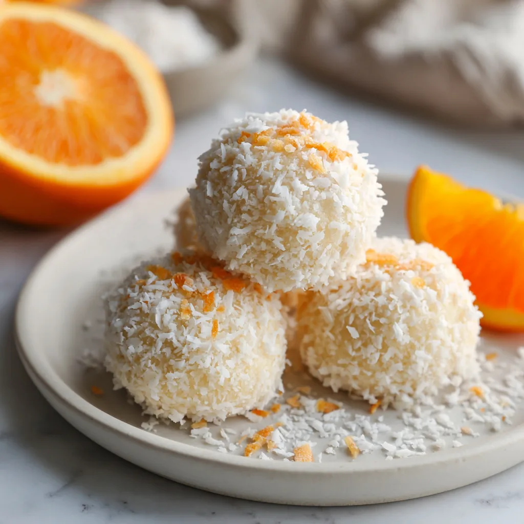 Soft no-bake coconut snowballs infused with fresh orange zest and juice for a bright, creamy dessert.