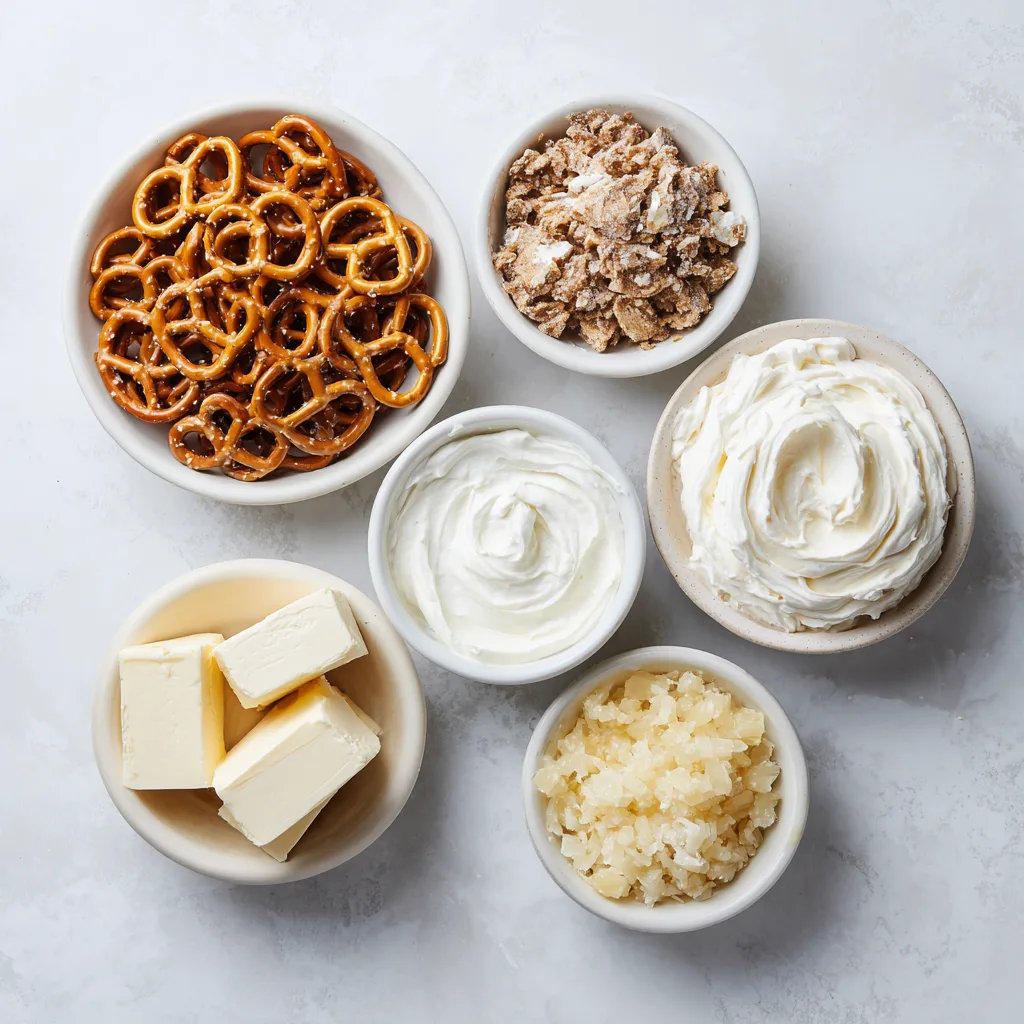 Mix crushed pretzels, melted butter, and ¾ cup sugar. Spread onto a baking sheet and bake at 375°F (190°C) for 6–8 minutes until golden. Cool completely, then crumble. - Make the cream layer: