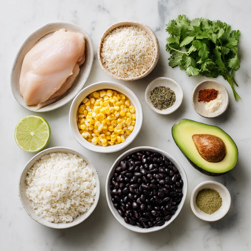 8. Top each bowl with shredded chicken, black beans, corn, avocado, cilantro, and any additional toppings you love.