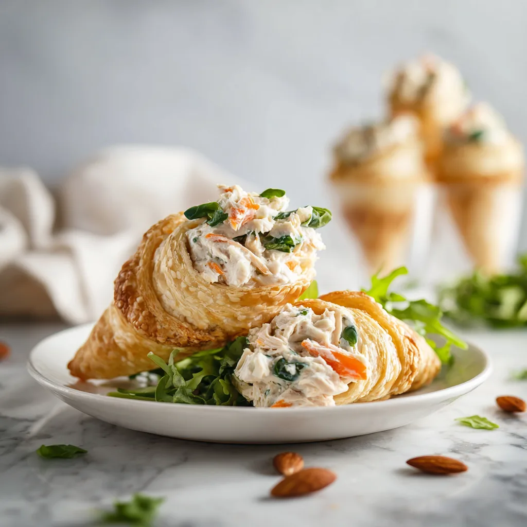Flaky pastry cones filled with creamy, flavorful chicken salad, perfect for elegant appetizers or gatherings.