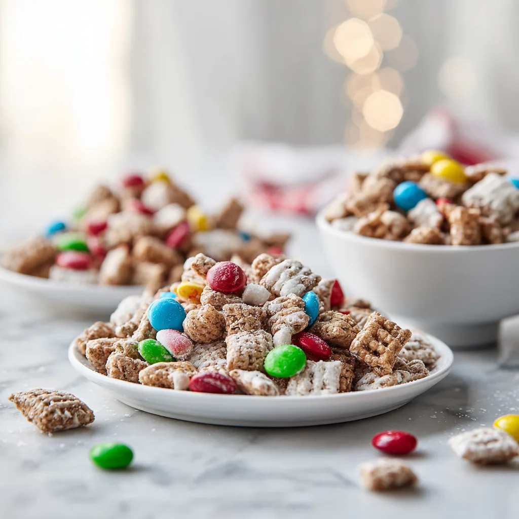 The colorful candies and powdered sugar coating give the mix a snowy holiday appearance.