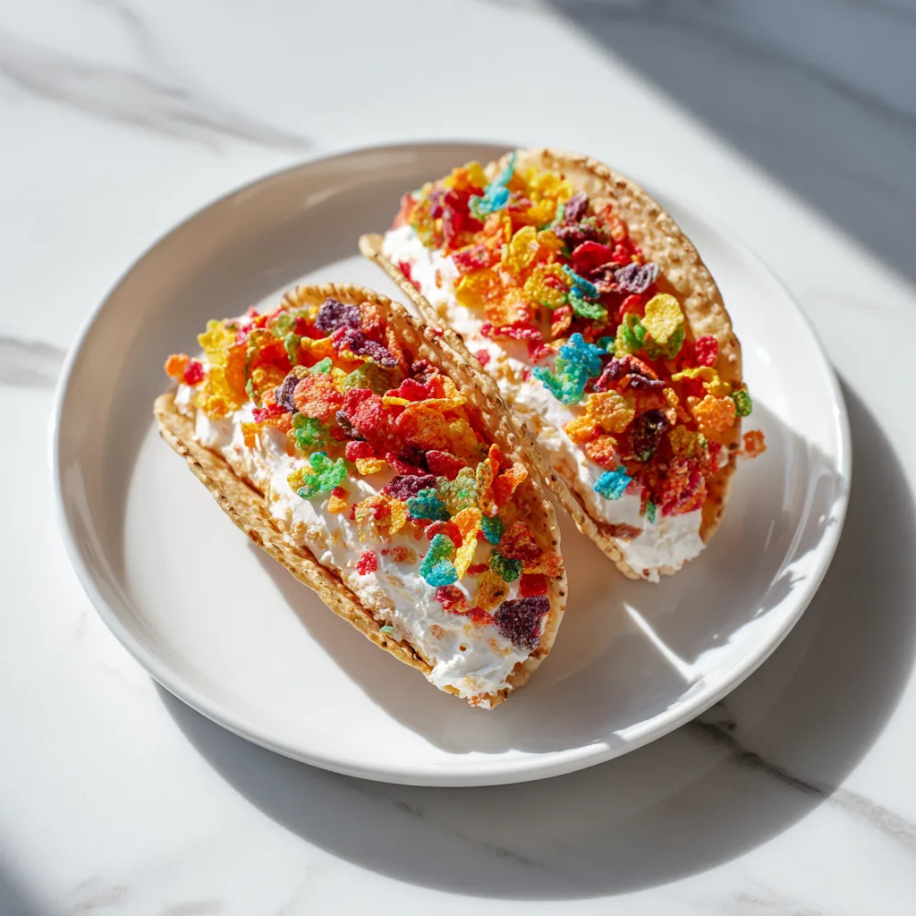 This recipe is perfect for birthdays, brunches, baby showers, or just when you want to make dessert a little extra. Imagine crunchy taco shells coated in Fruity Pebbles, filled with fluffy no-bake cheesecake cream, and topped with even more cereal for a vibrant, rainbow finish.